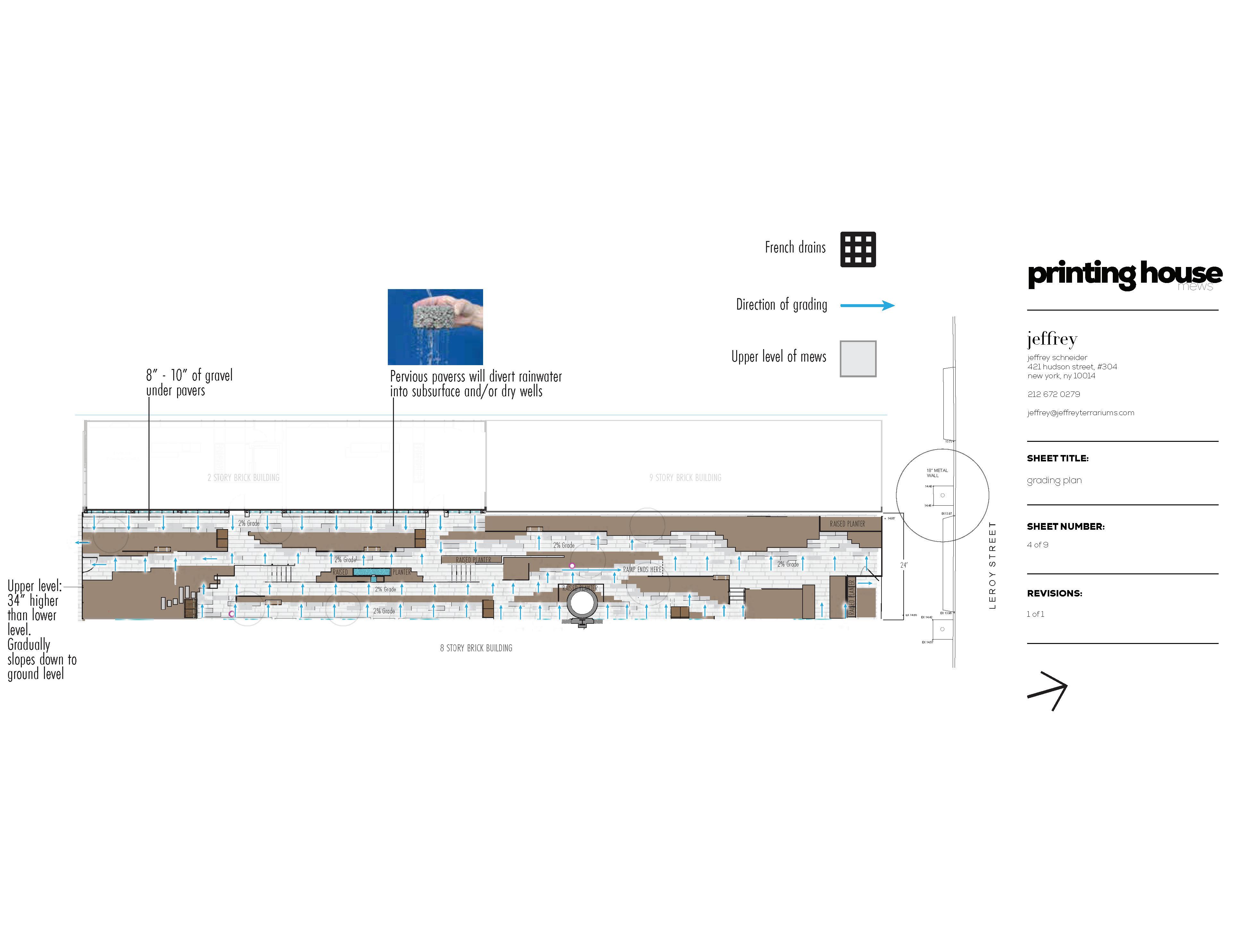 SEWER SEWER 150'-4" 125'-4" 78'-8" 45'-6" 3'-2" 100'-2" 44'-5" 200'-2" 98'-6" 4'-8" 43'-11" 120'-2" 26'-7" 14'-8" 14'-7" 18'-6" 18'-8" 18'-2" 17'-11" 3'-6" 26'-11" 26'-7" 106' 41'-11" 101'-9" 9'-11" 93'-6" 38'-11" 41'-11" 81'-9" 35'-4" 42'-4" 54'-6" 27' 45' 33' 34'-7" 32'-9" 27'-6" 35'-9" 104'-6" 64'-11" 51'-10" 35'-8" NOTES PART PLAN - MEWS DRAINAGE COPYRIGHT © 2011 WORKSHOP APD DRAWING INFO 01 02 03 04 REVISIONS 05 06 07 08 09 10 11 12 AMA PROJ. NO. B084-01-016 SCALE: DRAWN BY: PROJECT ENGINEER: DATE: SCHEMATIC DESIGN 01-24-14 06/26/13 ISSUED FOR COORDINATION PRINTING HOUSE PTH 421 Hudson Street, New York, New York 10014 CLIENT DESIGNER ARCHITECT OF RECORD STRUCTURAL ENGINEER AGBH Printing House Parent Company, LLC 152 West 57th Street New York, NY 10019 (212) 307-3110 Simpson Gumpertz & Heger Inc. 19 West 34th Street, Suite 1000 New York, NY 10001 T: (212) 271-7000 MECHANICAL ENGINEER AMA Consulting Engineers, P.C. 250 West 39th Street, 9th Flr New York, NY 10018 T: (212) 944-7722 KEYPLAN Michael Zenreich Architects, PC 149 West 36th Street, 7th Floor New York, NY 10018 (212) 242-7440 123456789101112 161514 13 17182021 19 22232425 TH1TH2 ALL DESIGNS & SPECS ARE SUBJECT TO VERIFICATION OF EXG. FIELD CONDITIONS 07/19/13 ISSUED FOR DD 09/05/13 INFRASTRUCTURE REVIEW 11/04/13 DOB HUB SUBM. 04 11/06/13 ISSUED FOR PRICING 01/24/14 DOB HUB SUBM. 05 01/24/14 ISSUED FOR CONSTRUCTION 3OF12 .02 OF PLUMBING DL DL 1"=20'-0" P-300 SITE PLAN 09/17/14 ISSUED FOR WATER HEATER 03/05/15 ISSUED FOR PAA 05/29/15 ISSUED AS SKETCH SKP-01 03/31/16 ISSUED FOR PAA REV'D PER DOB PAA CMNTS 04/18/16 421 Hudson St, #304 New York, NY 10014 T: (212) 627-0279