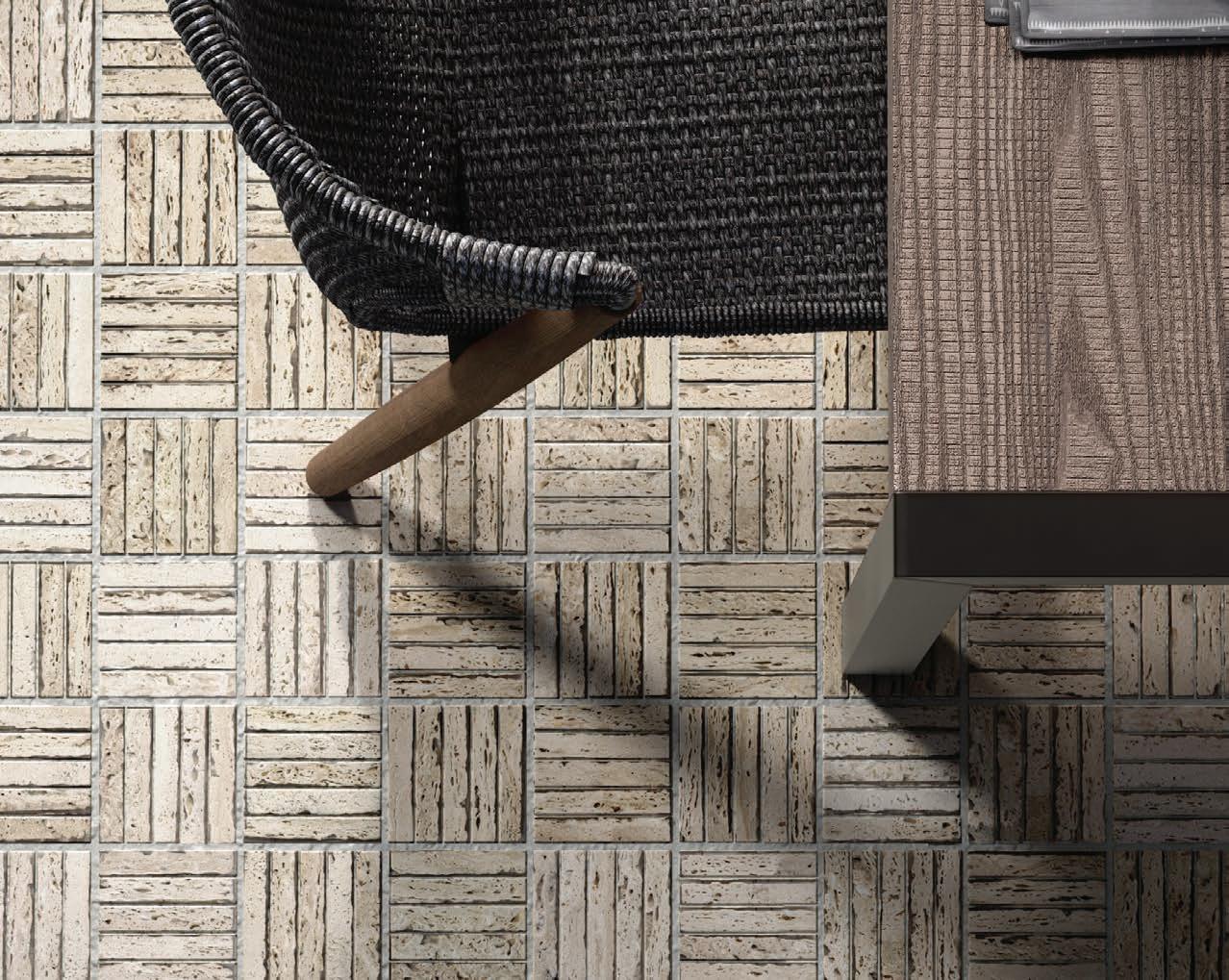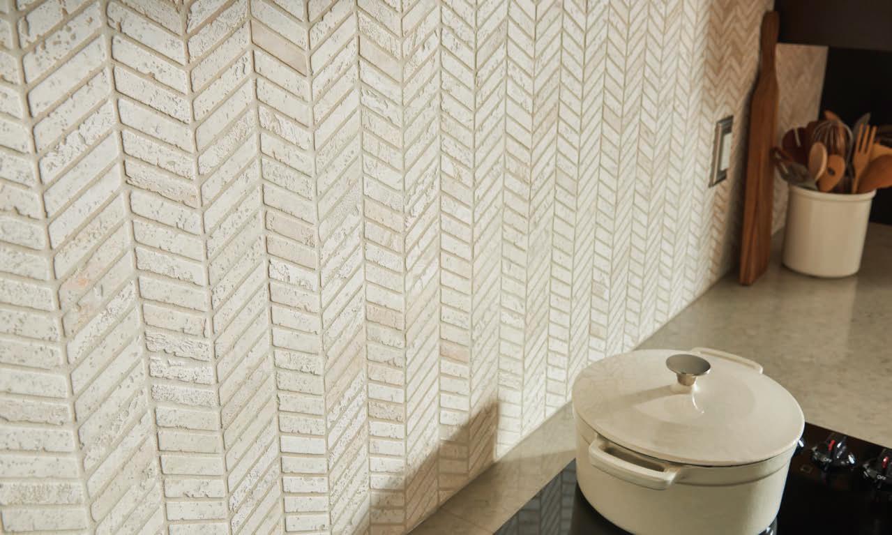 of each tile. The tactile and visually dynamic characteristics are achieved through the use of threedimensional surfaces. Arroyo gives a nod to modern traditional that meets a neutral understated palette.
