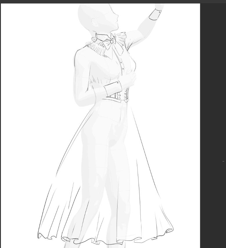 La ropa masculina estaba caracterizada por chaquetas, de todos tamaños y colores, en este caso se pensó en una chaqueta larga que cubriera hasta su falda, sobre la cual estaría su corset.
