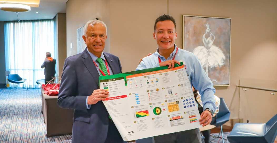 Ingeniero Bayron López junto a Ingeniero Favio casas con cartel de 14 controles de riesgos que evalúa el RETIE