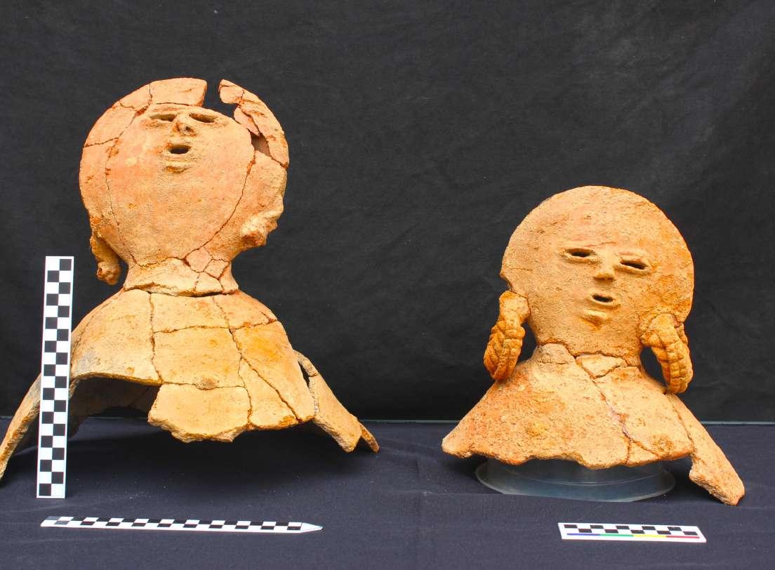 Las piezas halladas contenían restos humanos y presentaban tapas decoradas con rostros y orejeras.