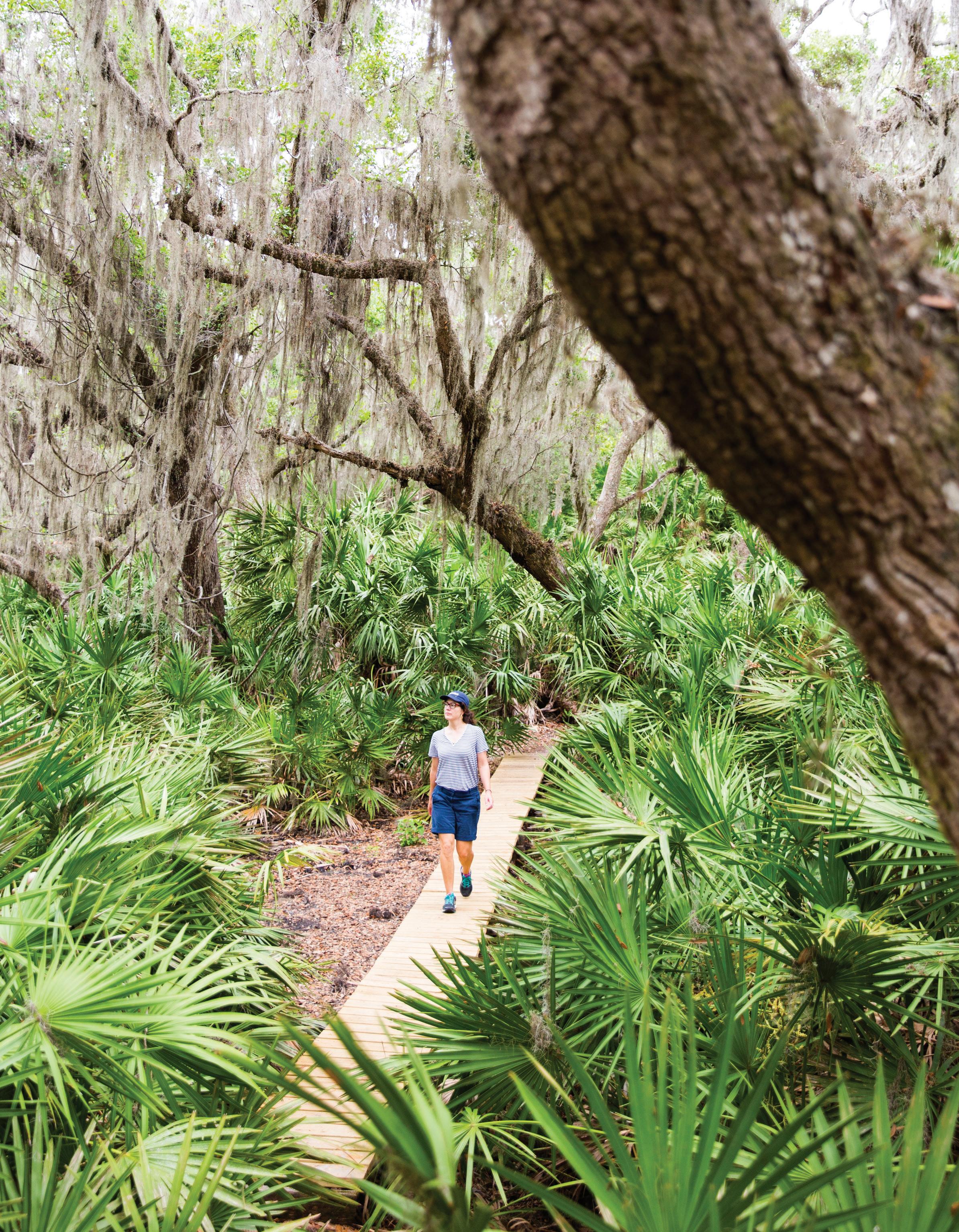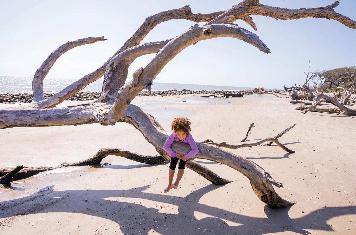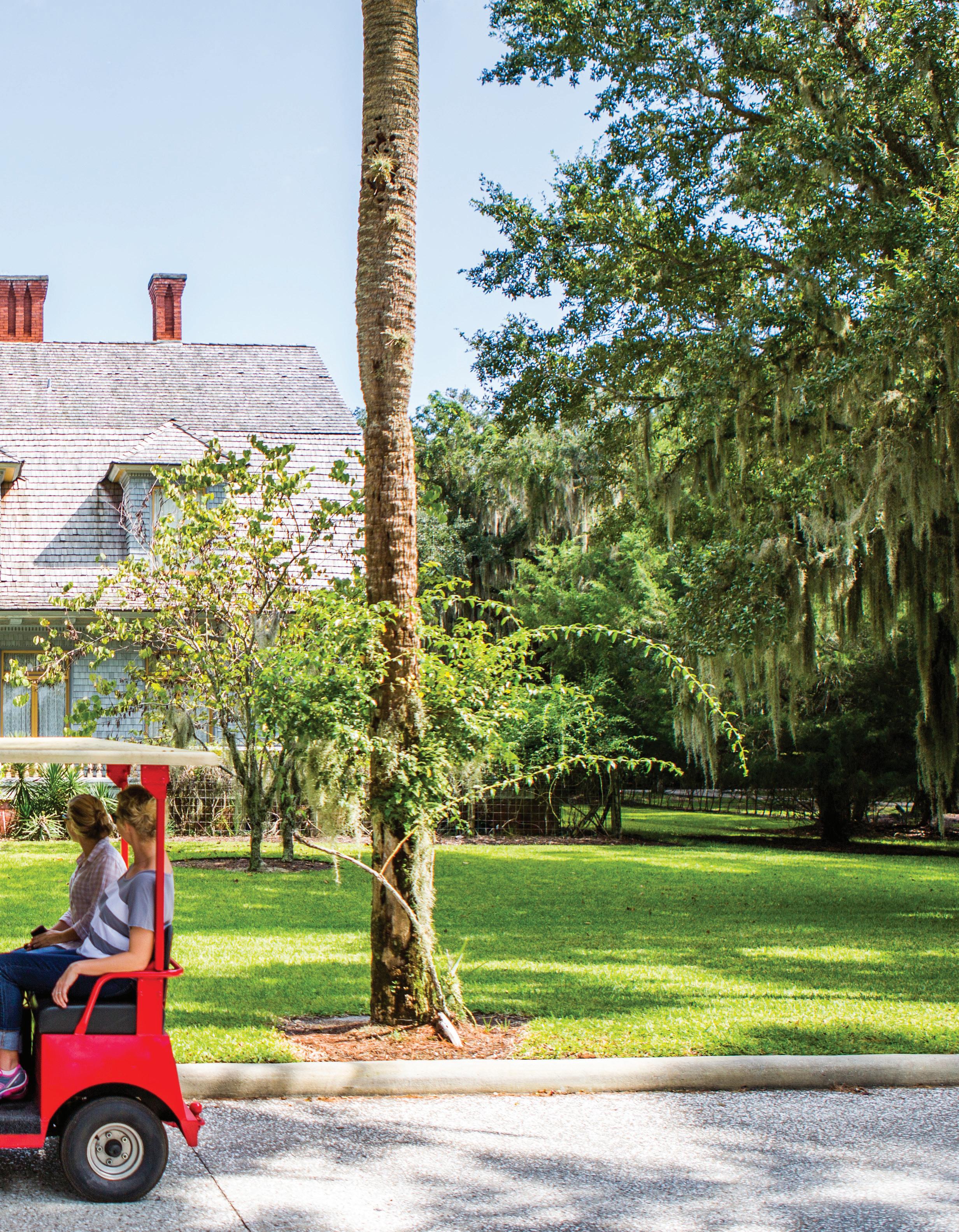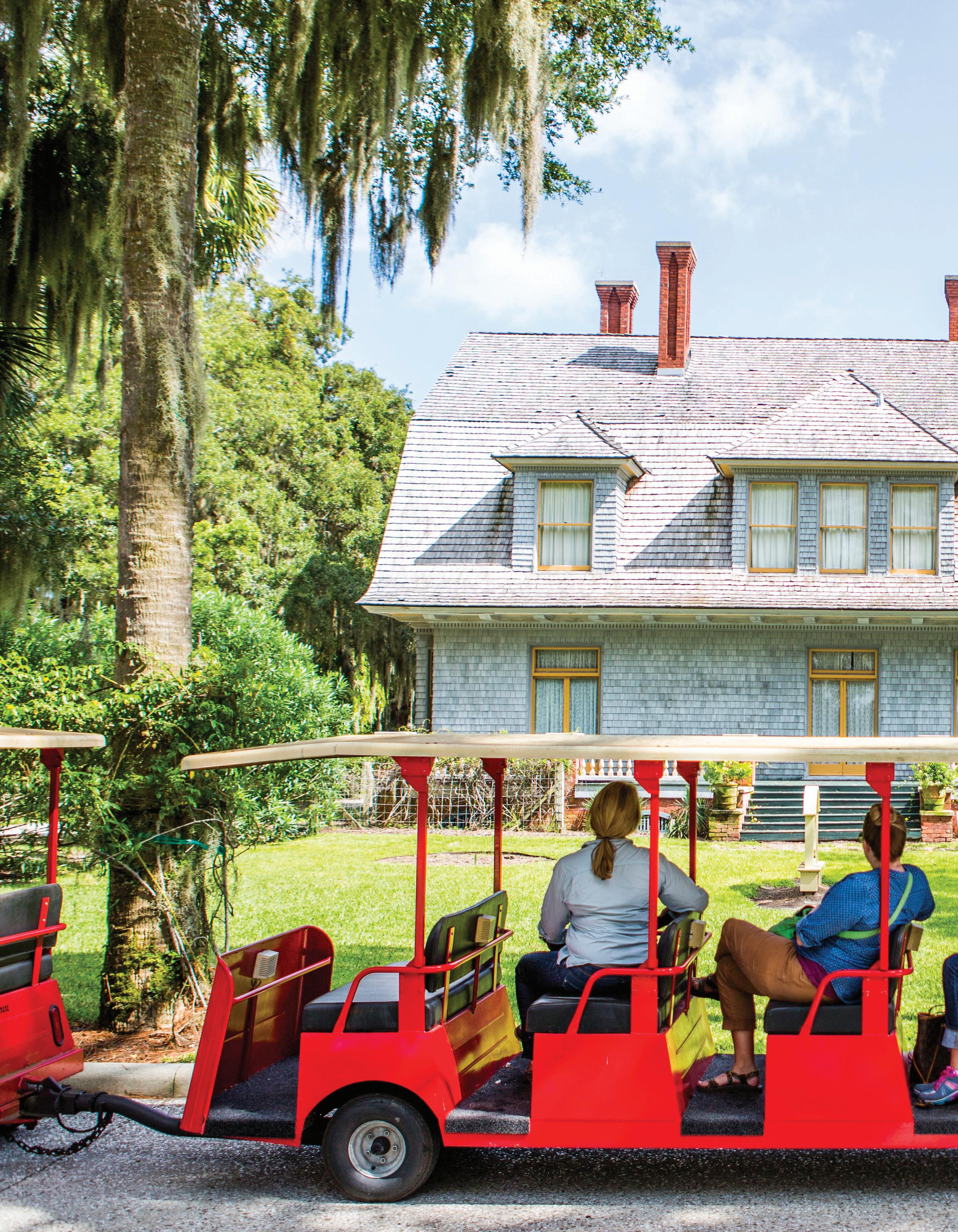 Sometimes the best way to connect with a place is on foot. The Jekyll Island trail system has over 30 nature and urban trails, including family- and pet-friendly routes. Do the 0.3-mile hike to Driftwood Beach, or stroll the 1.4-mile road from Horton Pond to Horton House. The Jekyll Island North Loop trail offers a comprehensive 18-mile excursion, while the very walkable Historic District makes it easy to wander and get steps in while learning about the Gilded Age. Jekyll Island Museum even has a selfguided walking tour with maps and interpreted signage to help you identify buildings such as Faith Chapel, which boasts an original Tiffany stainedglass window.