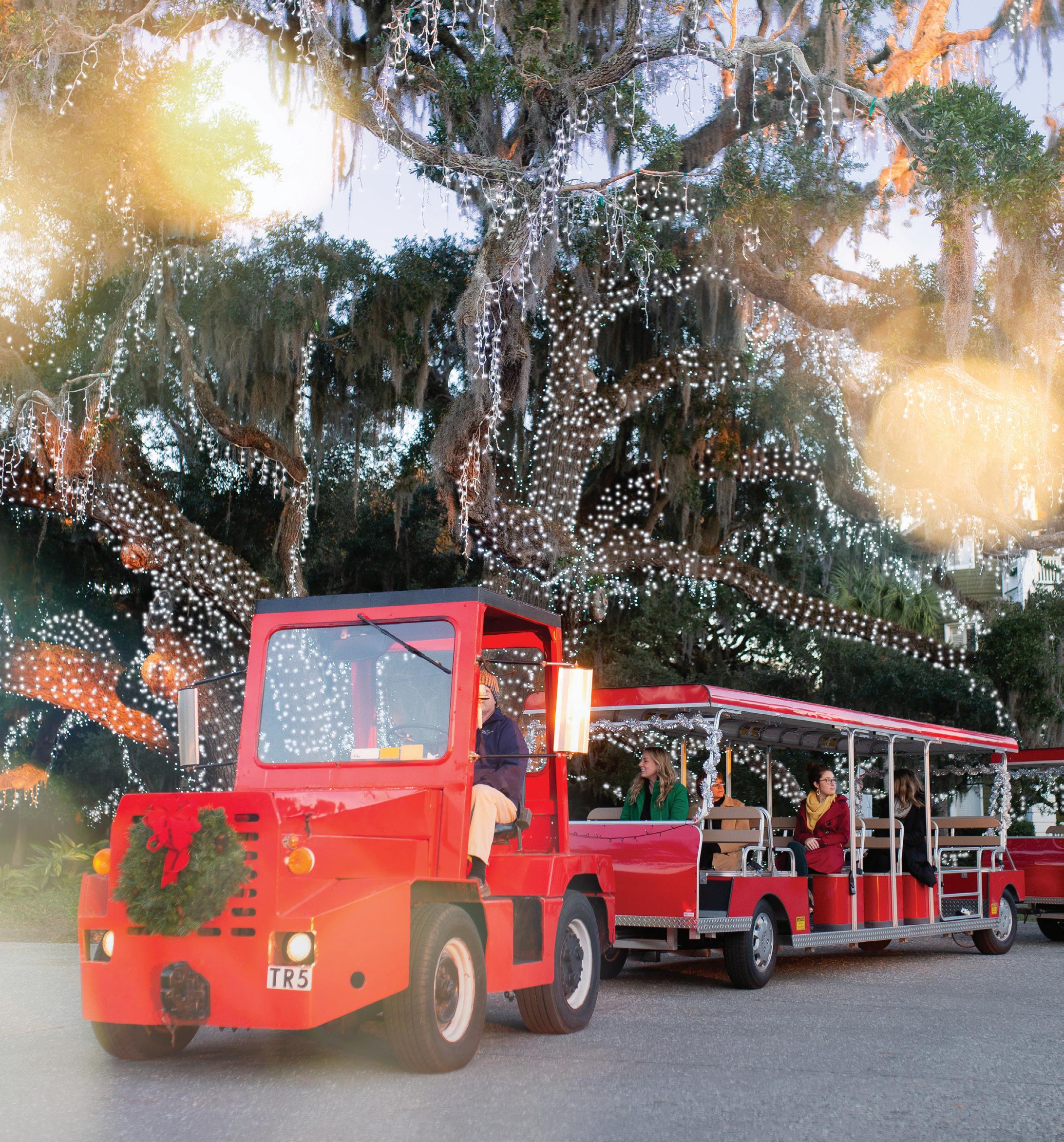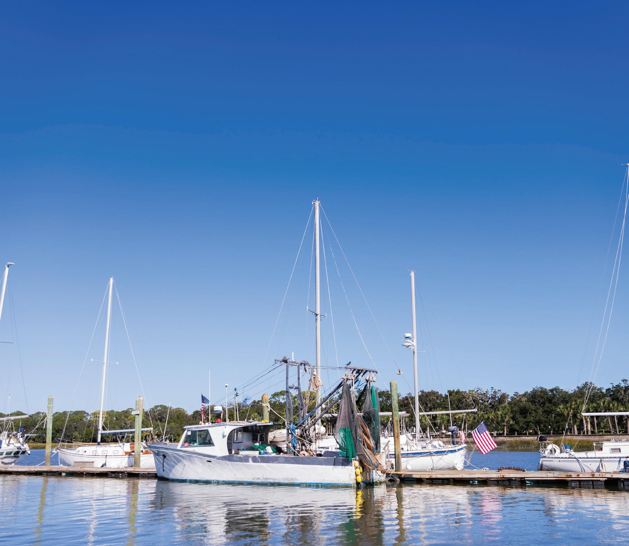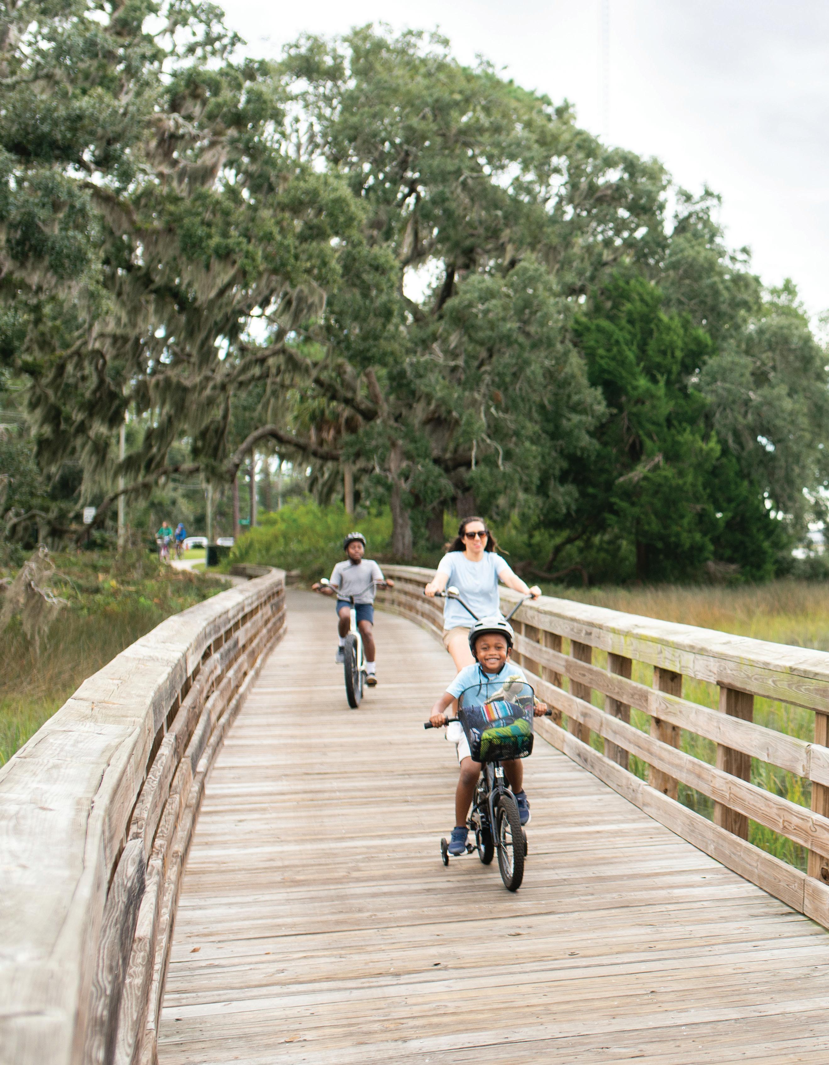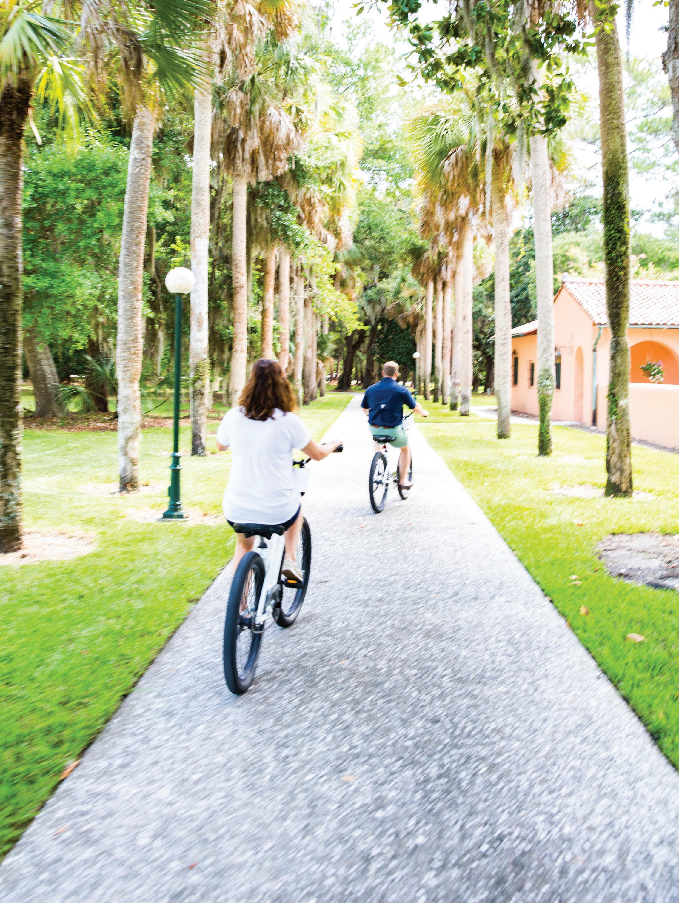 Sometimes the best way to connect with a place is on foot. The Jekyll Island trail system has over 30 nature and urban trails, including family- and pet-friendly routes. Do the 0.3-mile hike to Driftwood Beach, or stroll the 1.4-mile road from Horton Pond to Horton House. The Jekyll Island North Loop trail offers a comprehensive 18-mile excursion, while the very walkable Historic District makes it easy to wander and get steps in while learning about the Gilded Age. Jekyll Island Museum even has a selfguided walking tour with maps and interpreted signage to help you identify buildings such as Faith Chapel, which boasts an original Tiffany stainedglass window.