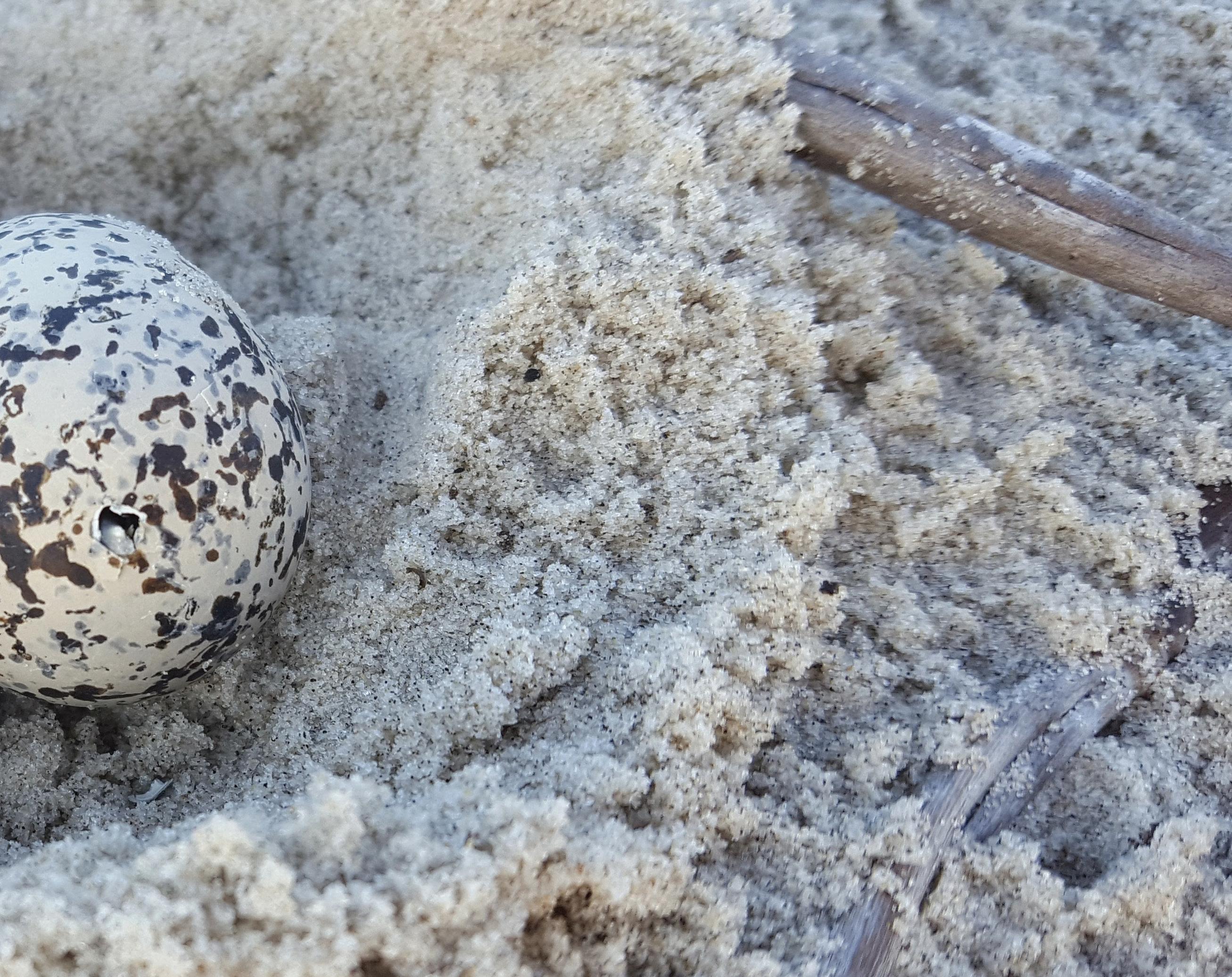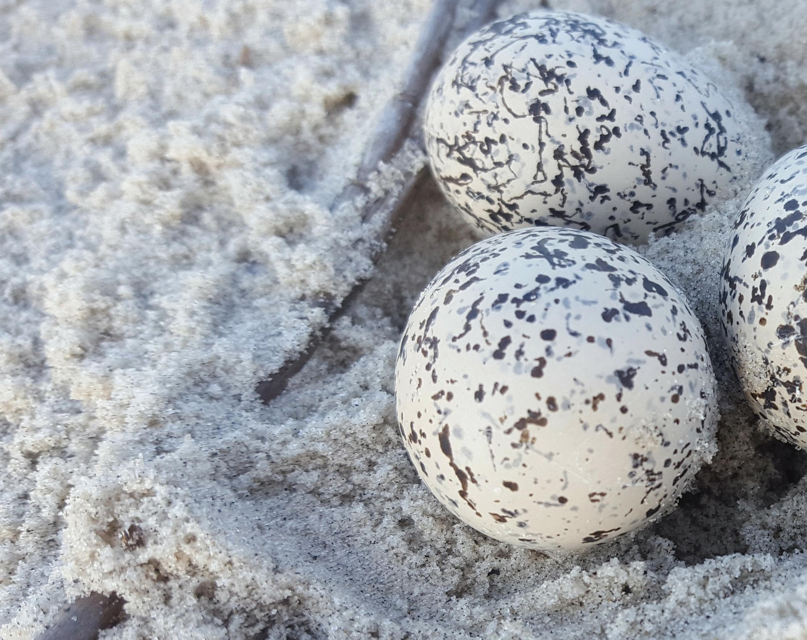 Nighthawks and shorebirds such as Wilson’s plovers tend to sit on their nests in dunes, relying on camouflage until beachgoers are practically on top of them. Their spotted eggs, even on close inspection, can look exactly like sand. “We look for their eggs, which sit in a shallow bowlshaped nest that has footprints leading to it,” says Colbert. “The