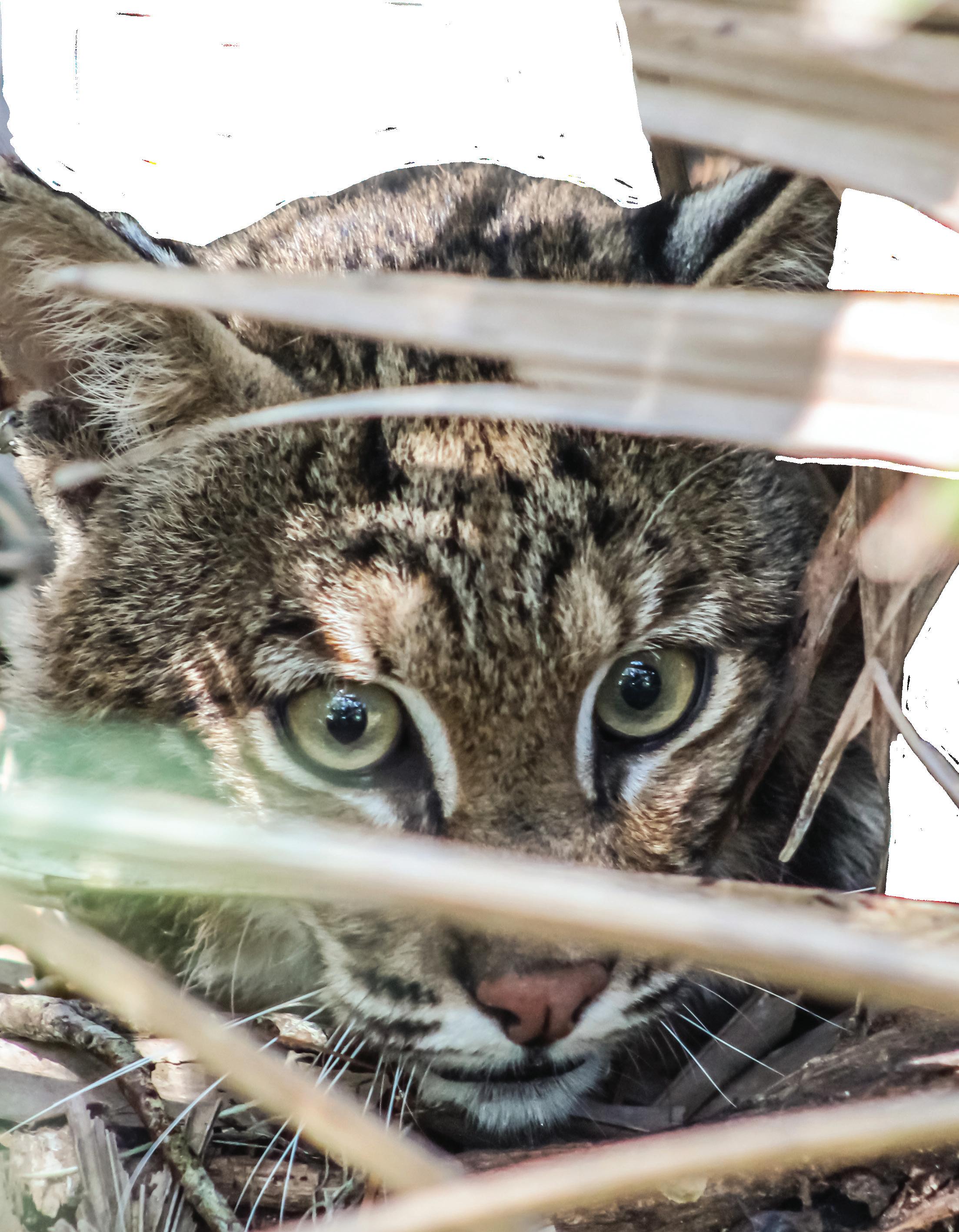 Bobcats are another alpha species that commonly hide in plain sight. With spotted and striped fur that mimics blades of grass, sticks, and twigs, bobcats are patient, creeping hunters capable of sitting still for long periods before pouncing on rabbits, squirrels, and other rodents, and sometimes smaller deer. About a dozen adult bobcats have been found on Jekyll to date. “They kind of prowl and are hard to see, like how a cat moves in tall grass with just its eyes sticking out,” says Colbert. “People don’t see them often on the island unless they’re quiet.”