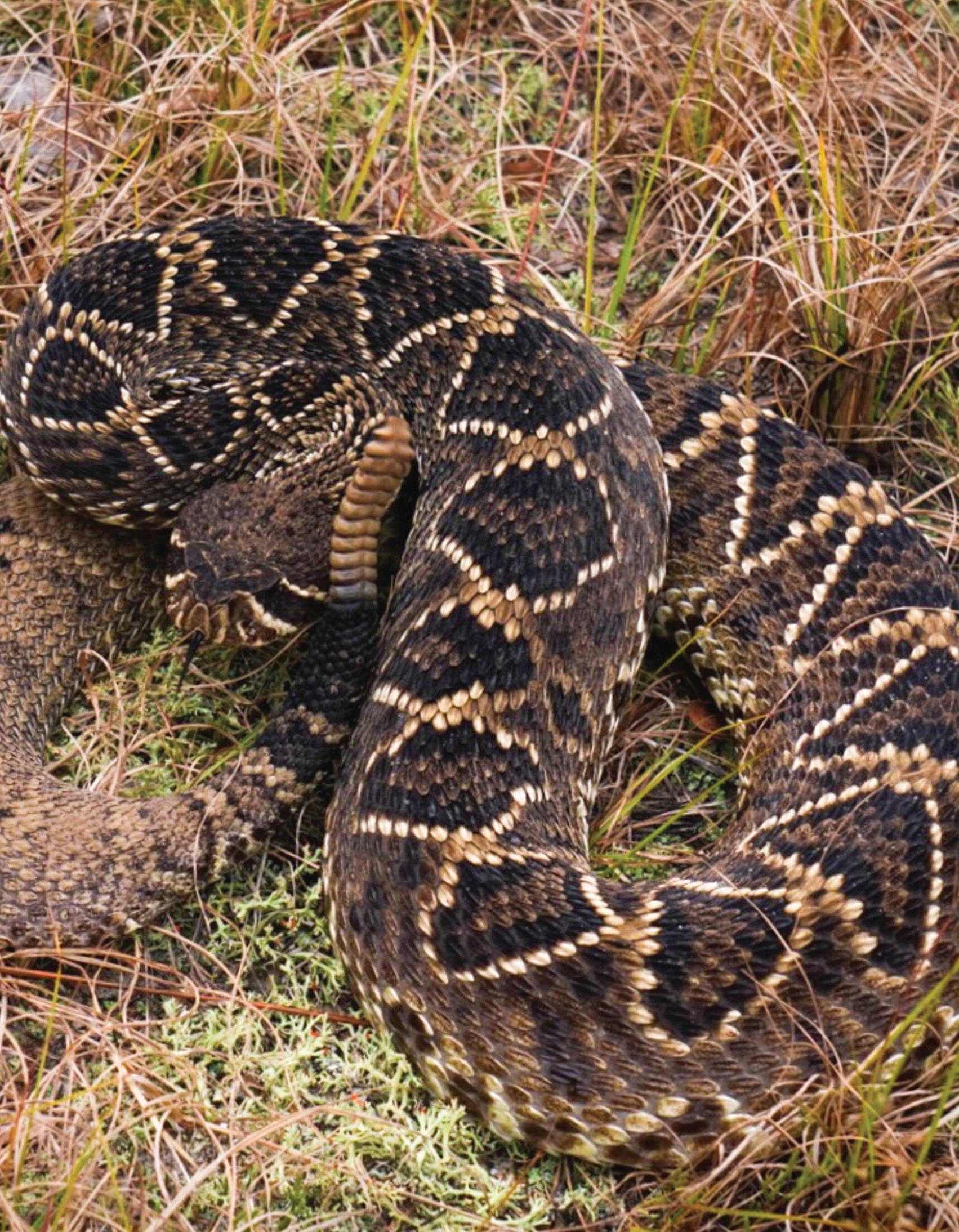 found in three distinct home ranges: upland marshes, dune systems, and maritime forests. A “barometer” or “umbrella” species at the top of the food chain, like rattlesnakes, can use crypsis to stay undetected and thrive; when the umbrella species is thriving, it benefits the rest of the animals in the habitat by keeping things in check. Rattlesnakes’ dark-light diamond patterns are extremely effective camouflage, but only in the right places, with the proper cover. Evidence also suggests they’ve evolved to become smaller. Eight-foot individual rattlesnakes used to be common, but due to various threats over generations, the species evolved into a reduced size. Today, the largest individuals rarely reach six feet in the wild. There are instances, however, when crypsis backfires for rattlesnakes.