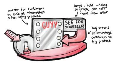 The day cream from GUYY Cosmetics is aimed towards teenagers and adults who are looking for a product to nourish their skin, however, the brand has just started up in a very saturated market, therefore needs to be known. To do this, they require an attractive, eye-catching promotional display stand for their day cream's product line. The stand could have a set of unique features, as well as maintaining the brand image to give a good impression to potential new customers.