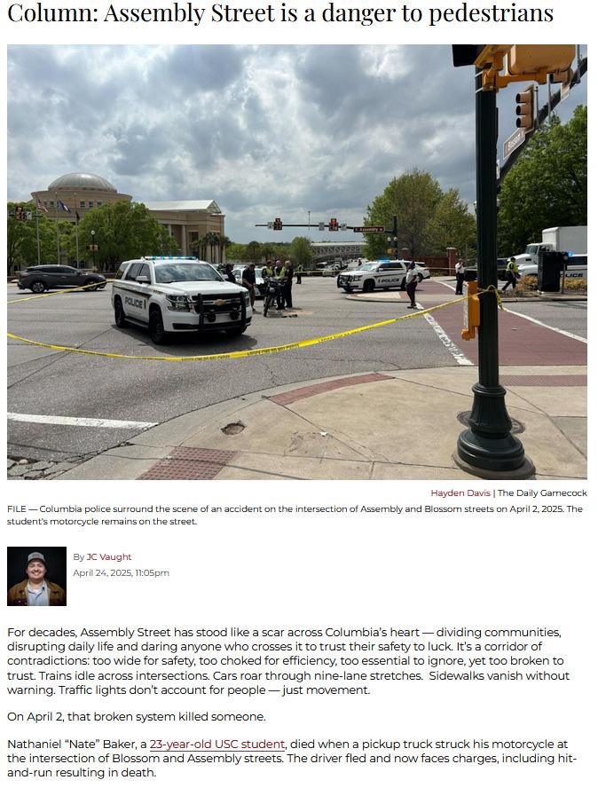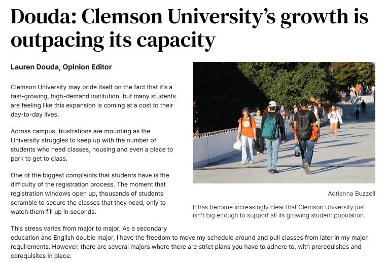 This column clearly and concisely lays out students' frustrations due to university's fast growth. Takes first place for clean writing style, well-organized points and a clear call for Clemson to make needed changes. Judges would like to commend the high quality of dozens of columns and editorials in this category.