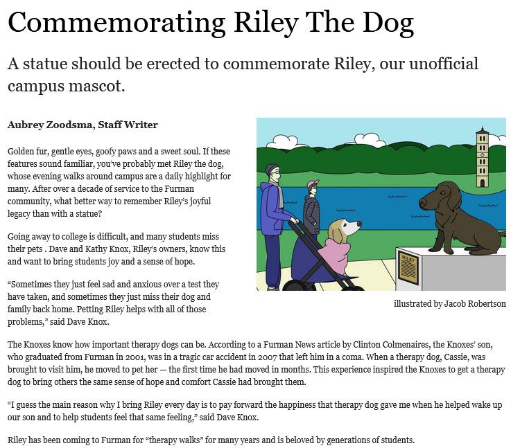 Writing about a dog is usually a certain way to get readers. However, this tightly written piece about a nontraditional source of community on a college campus kept me reading and left me with a smile. In a category of very heavy subjects, I was glad to see a writer with the chops to challenge the administration to erect a statue to a dog that connected a campus. This was a good idea for a column and well-executed.