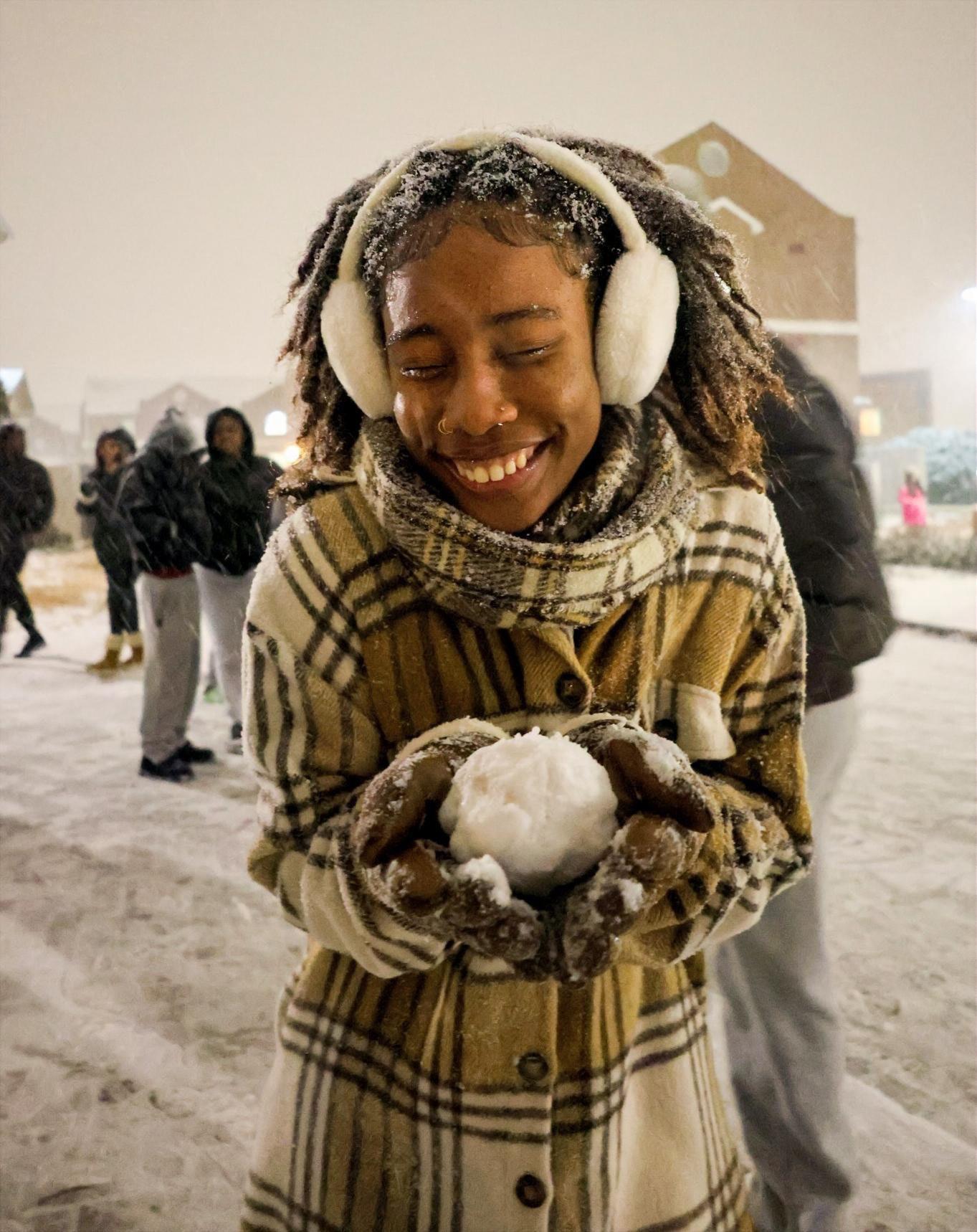 Joy at the snow is readily apparent on the subjects face. The picture draws you in and you want to be there too.