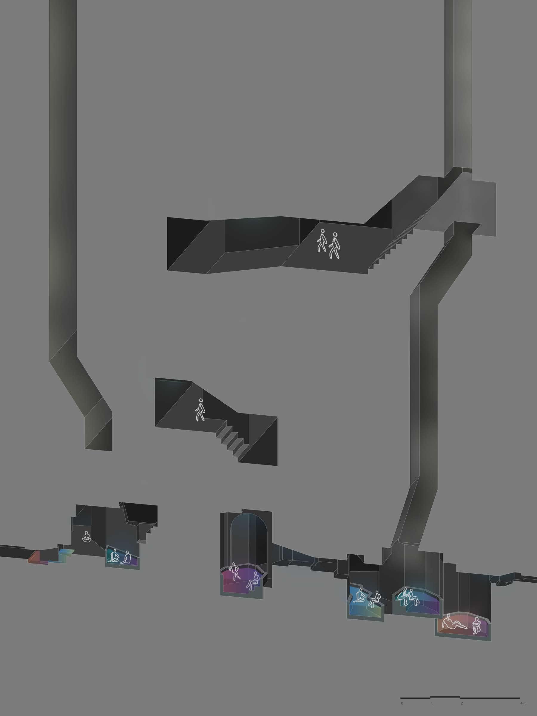The invisible city below Paris creates an ambiance of defeaning silence and isolation, an environment to disappear in. The catacombs below Paris are death and end of life, terrifying, yet thrilling. As Paris melts and disintegrates with the inevitabilities of climate change, the proposal of a transition to living underground drives this project. Solace and new life could now be found below. The project introduces a system of baths following the natural movement of the underground and creates opportunity for tranquility and reflection. The journey through the underground becomes immersed in water, the baths taking up more and more space so the only option for movement and discovery is through water.