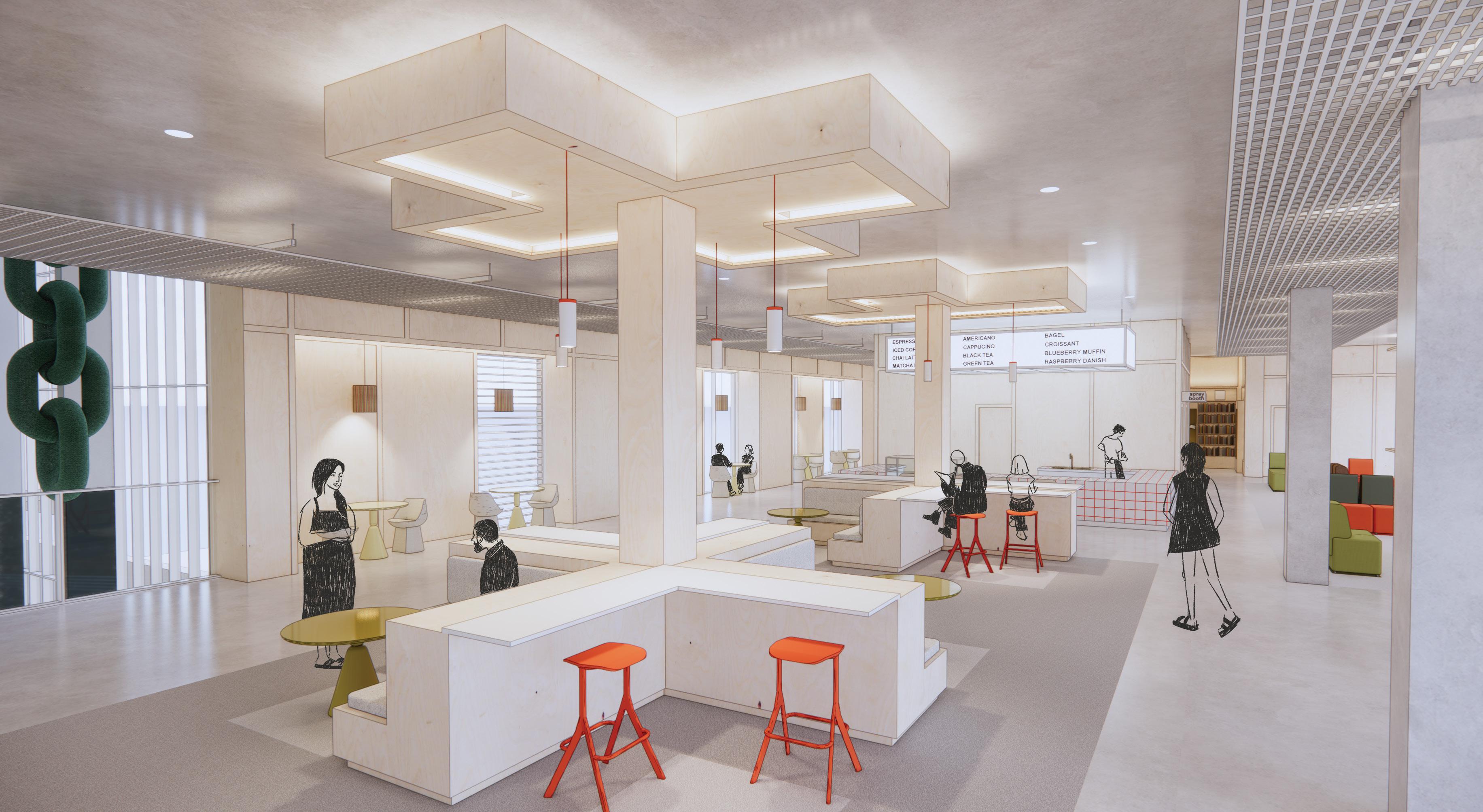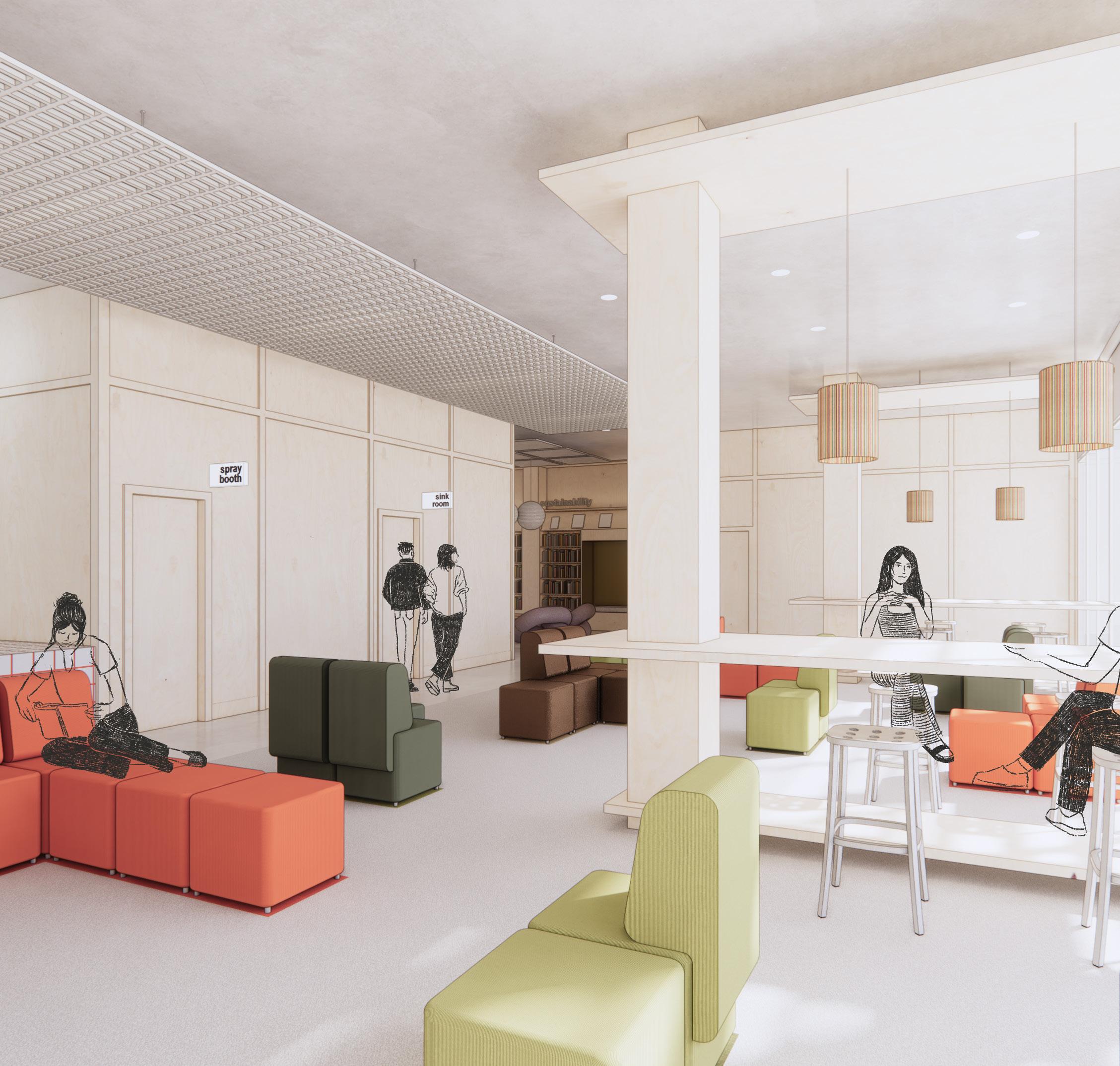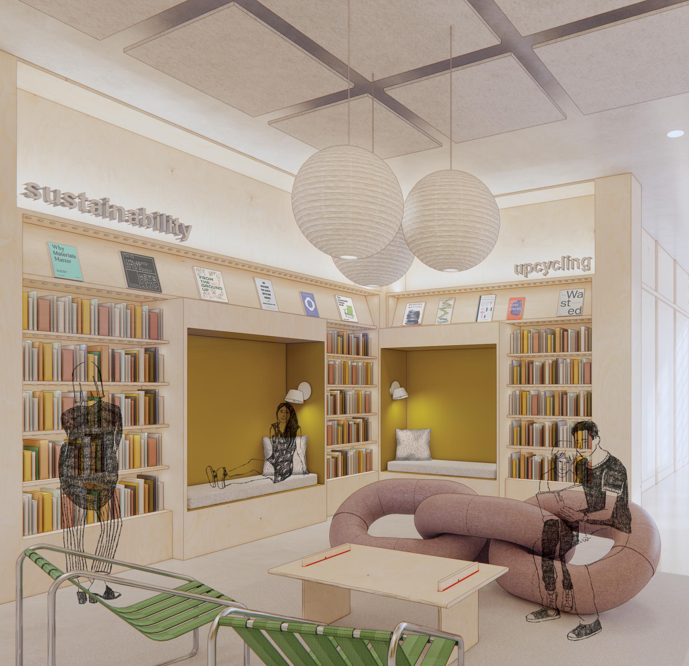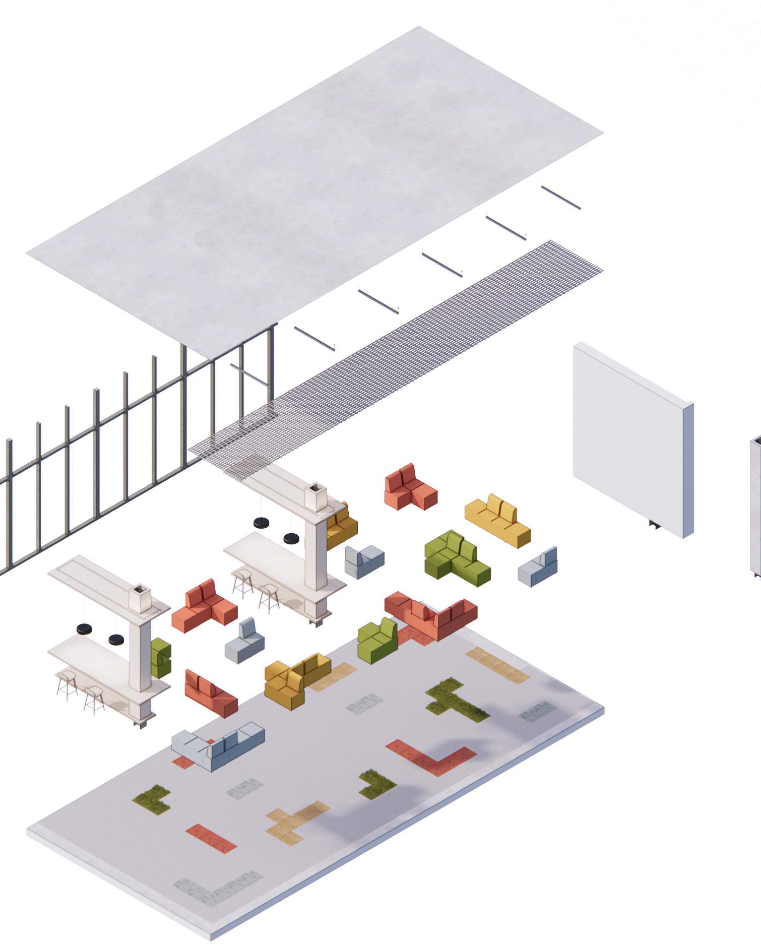 the makerspace lounge is a seating area with bar height table seating as well as a modular seating used to apply the concept. the seating module materials match the material of the carpet and a color grid directs users where the modules belong when not in use but allow users to move them as they please in order to encourage connecting with each other.