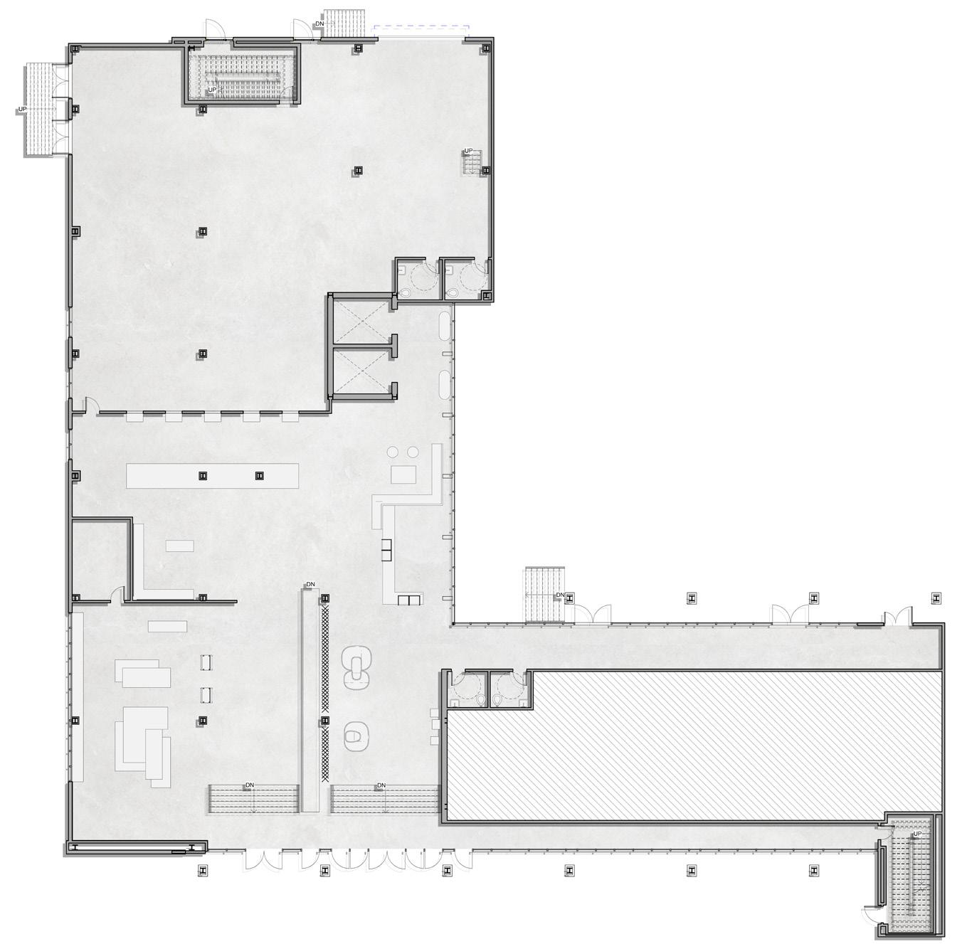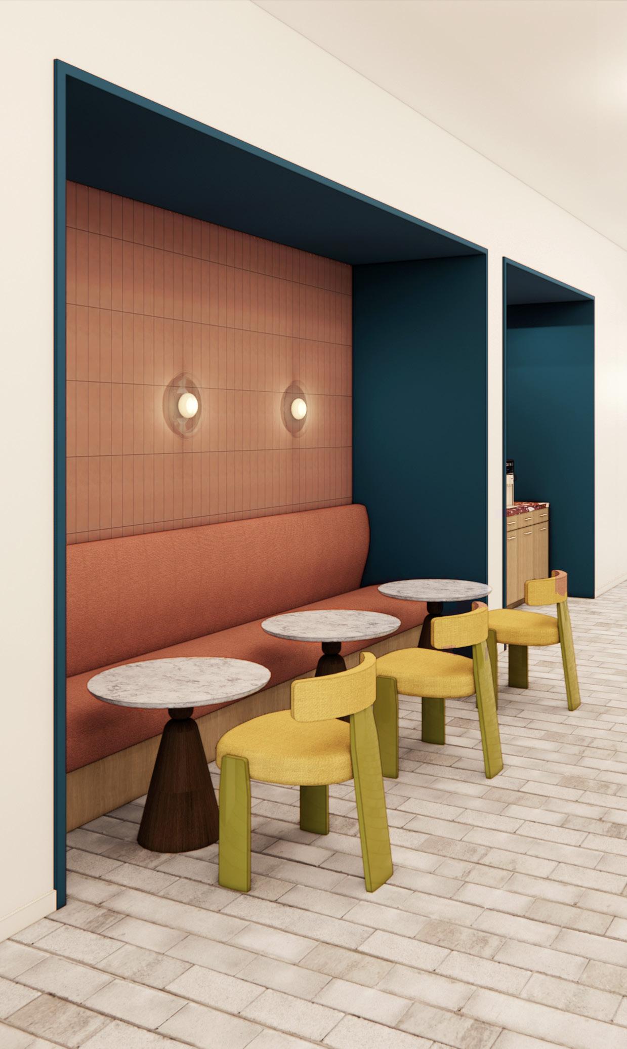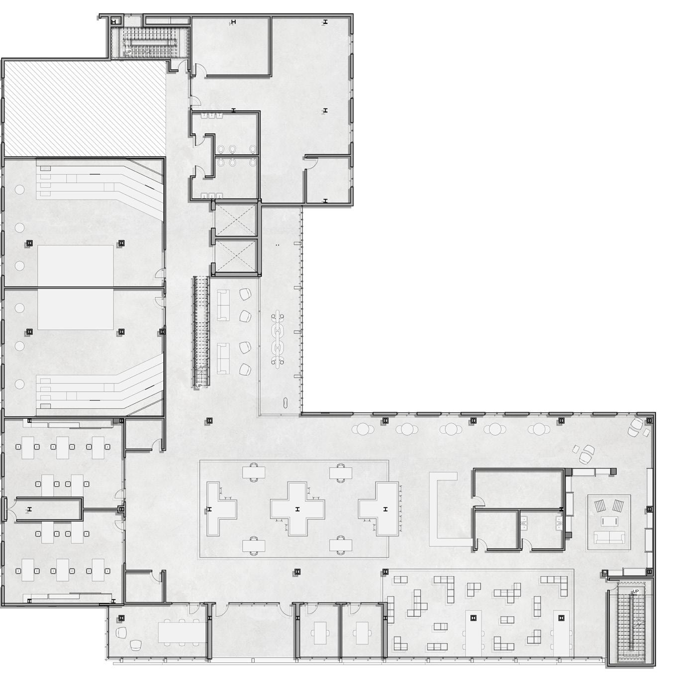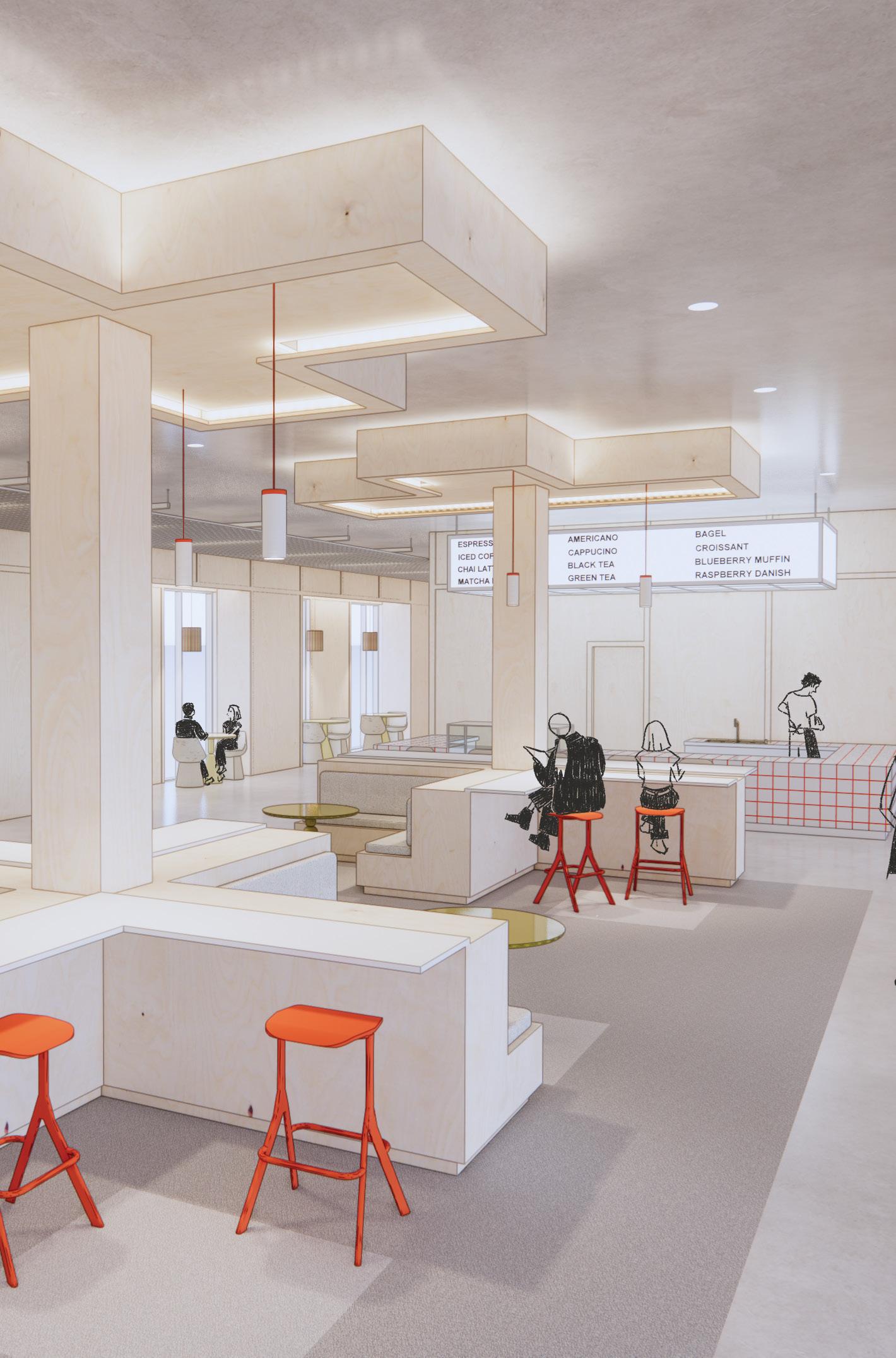 the makerspace lounge is a seating area with bar height table seating as well as a modular seating used to apply the concept. the seating module materials match the material of the carpet and a color grid directs users where the modules belong when not in use but allow users to move them as they please in order to encourage connecting with each other.