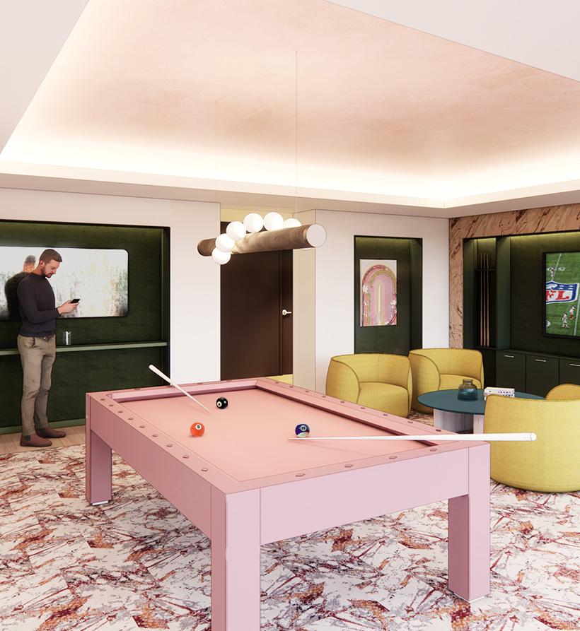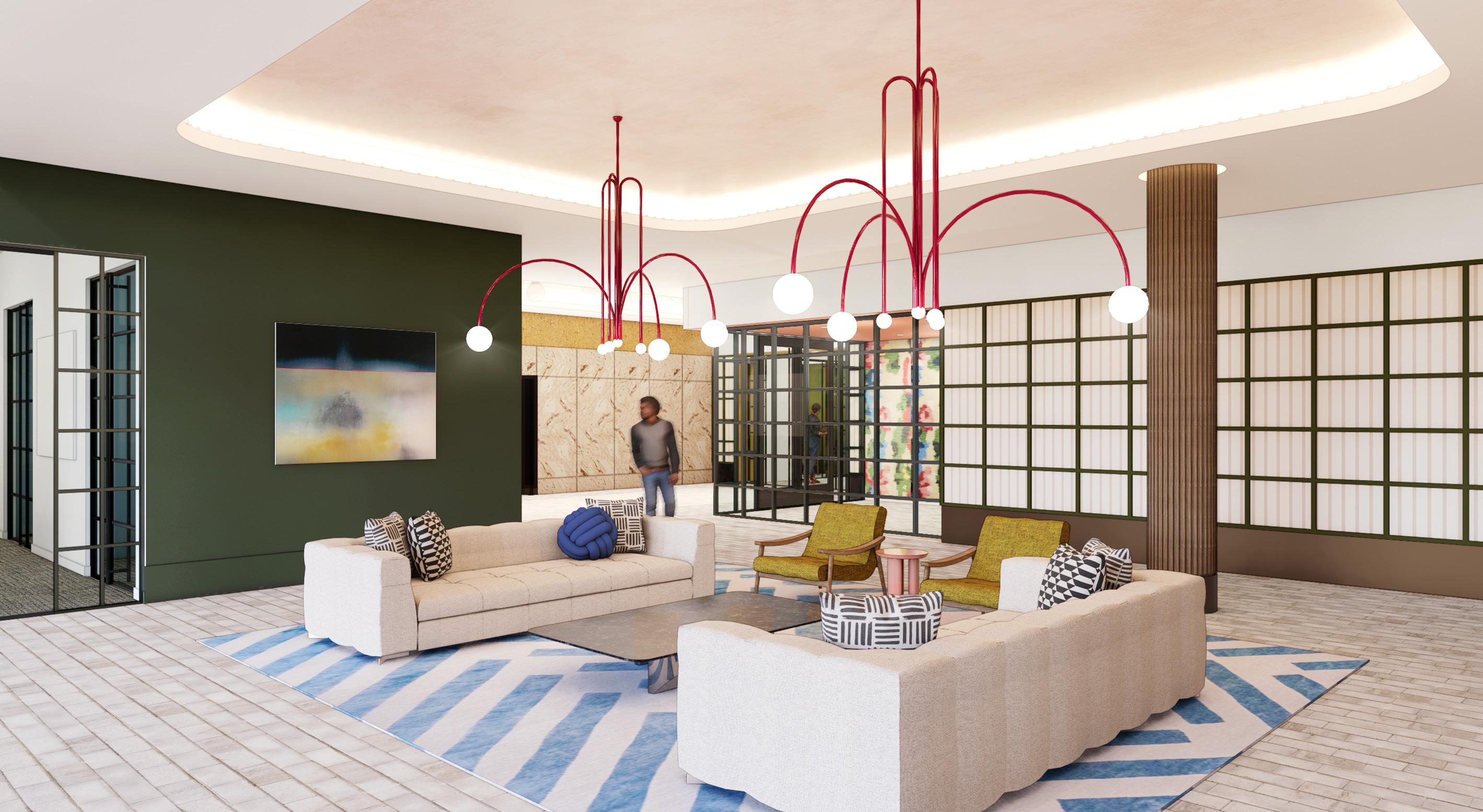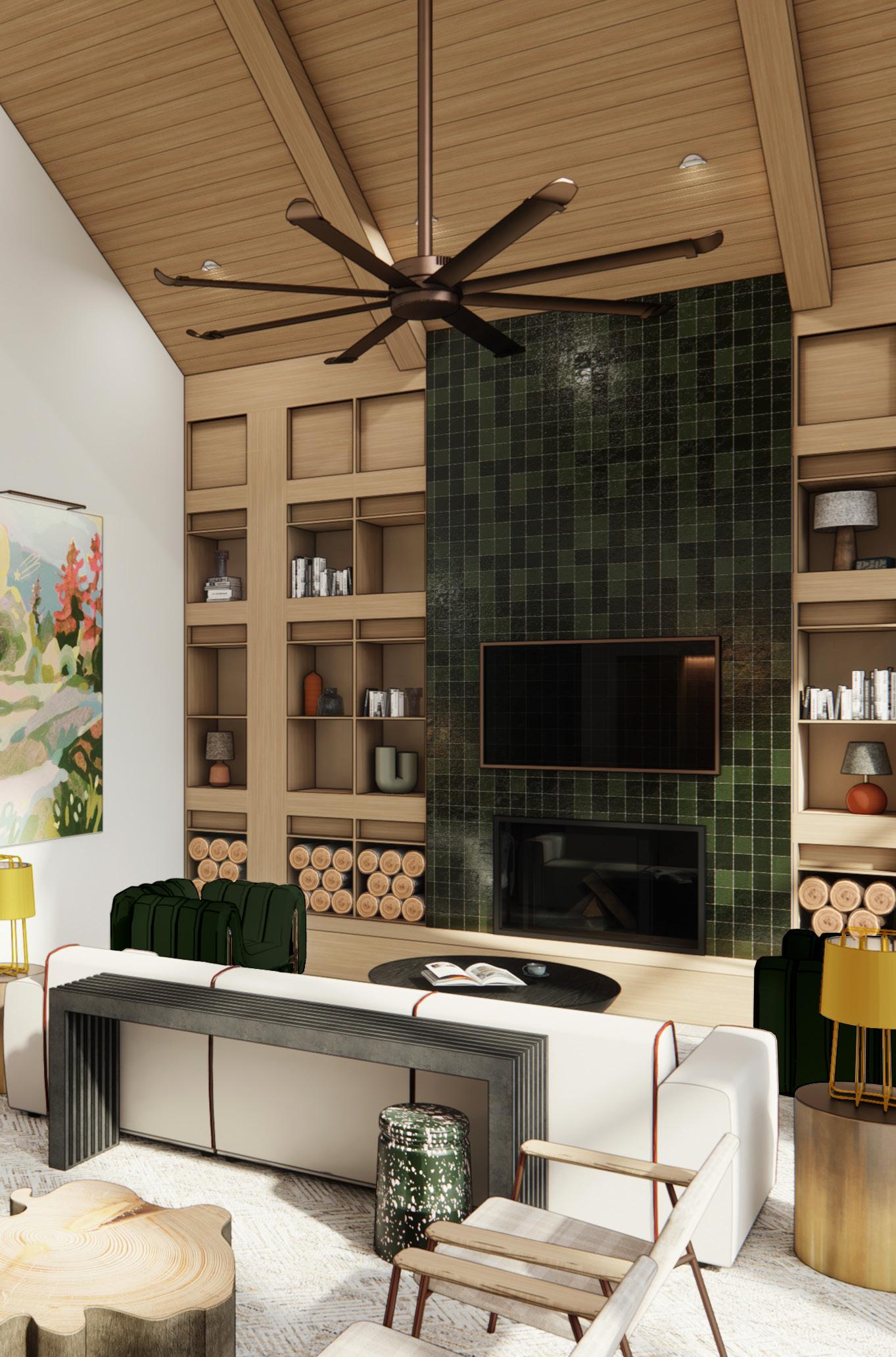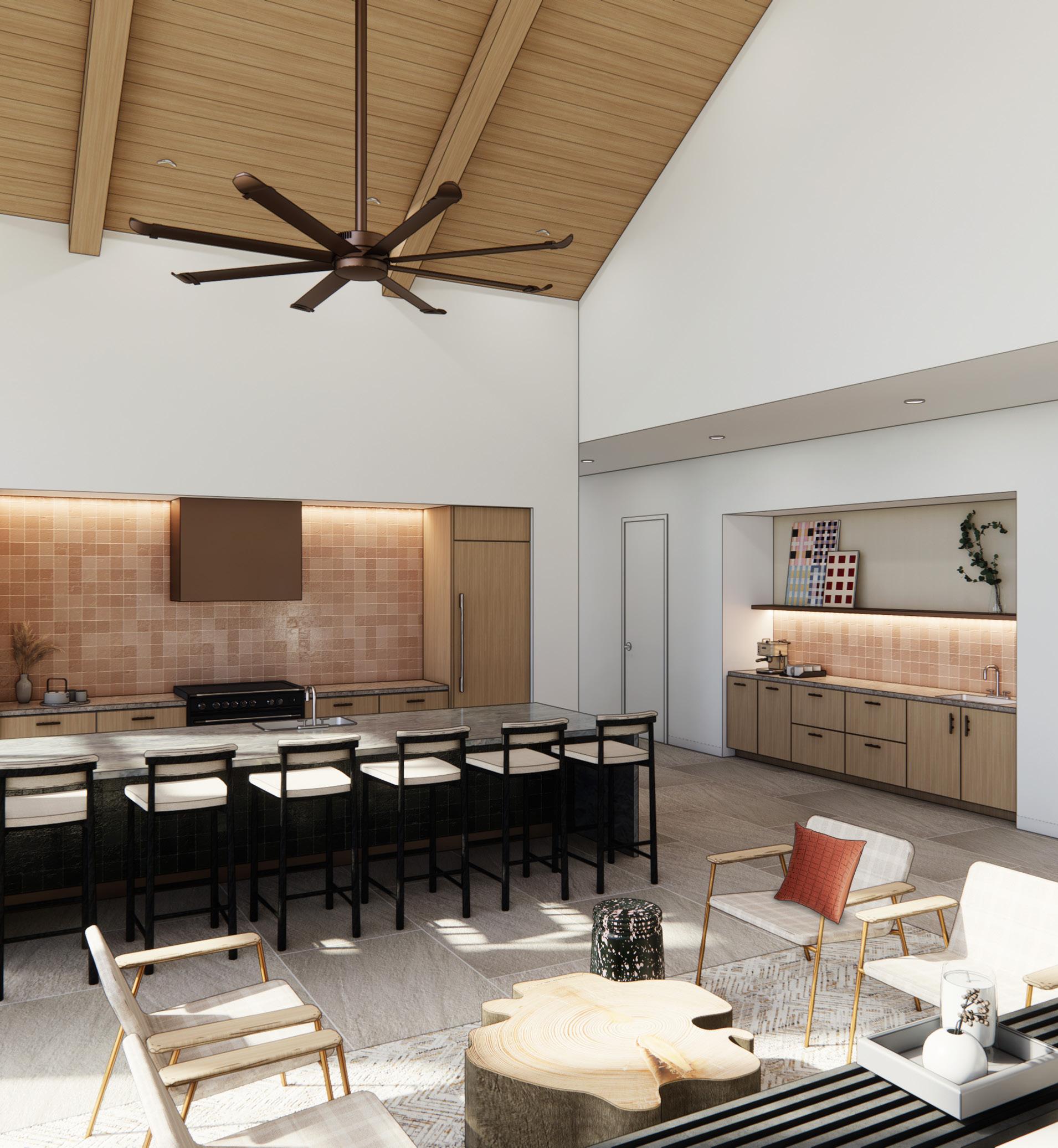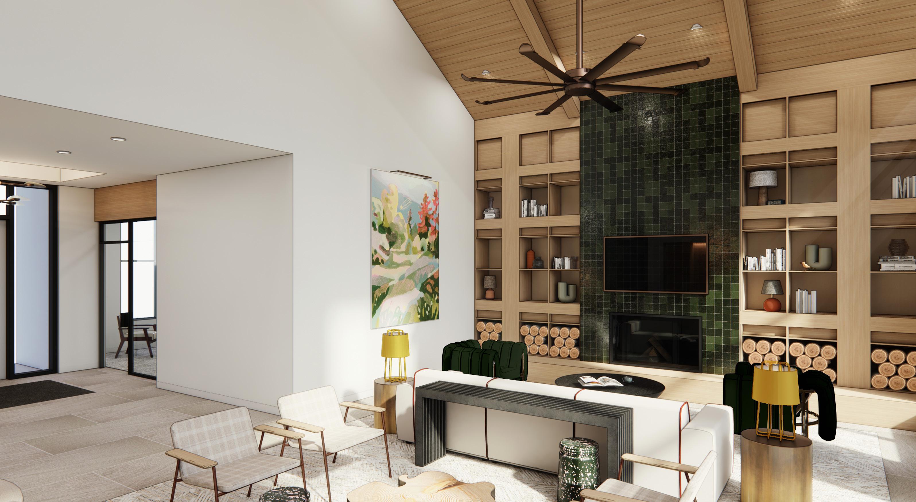 wrighthaven square, a multi-family community set to be built in richmond, VA, features a clubhouse inspired by scandinavian architecture and pitched roofs. the design embodies the concept of a natural grove, incorporating elements reminiscent of a vintage camping aesthetic throughout the clubhouse. these details can be found in spaces such as the leasing suite, living room, entertainment kitchen, and restrooms.