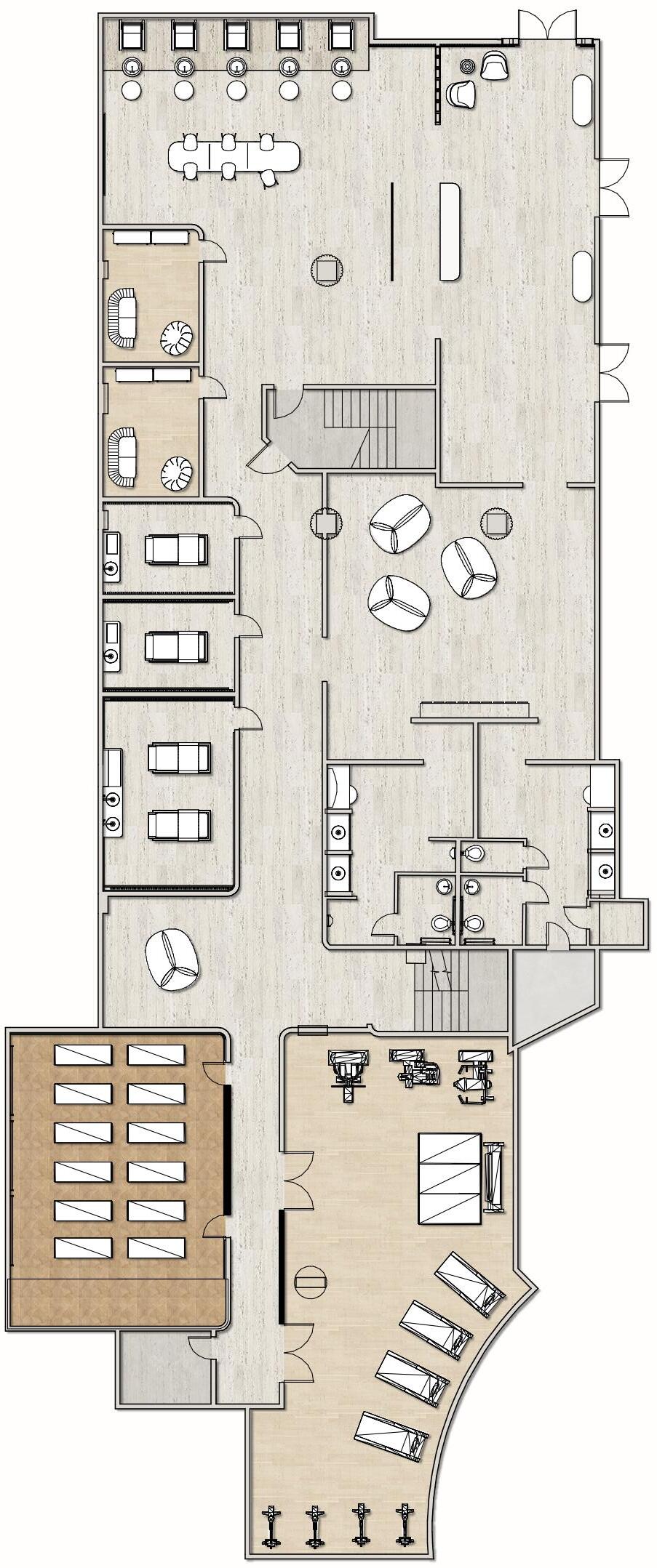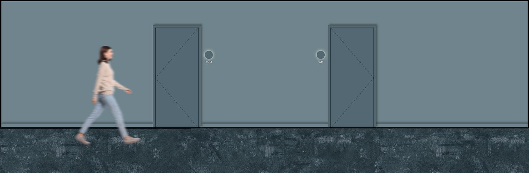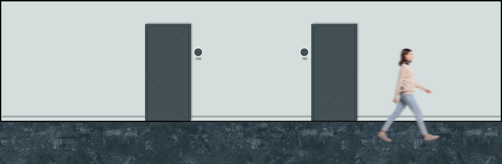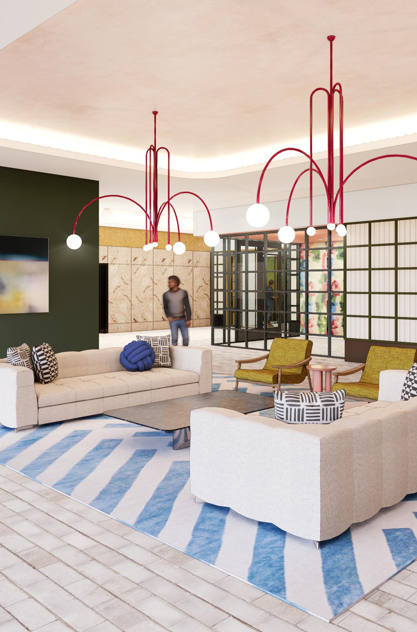 the concept of merge continues on to the residential floors of the building through a corridor scheme in which paint colors transition from dark to light as users move towards the center of the building to create the illusion of a gradient.