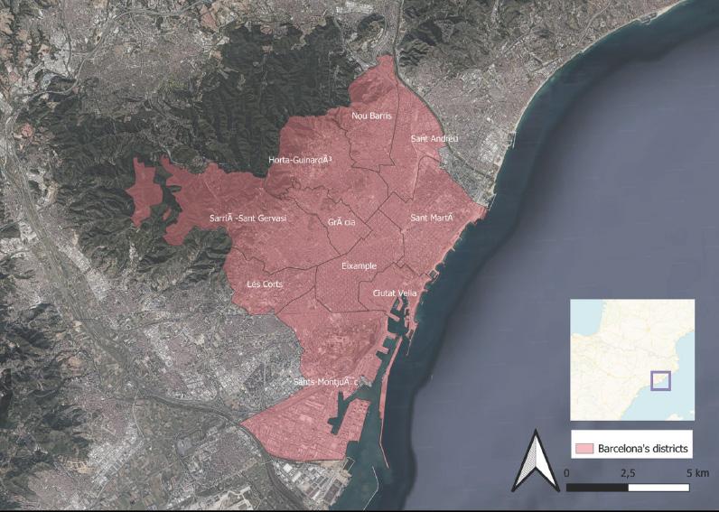 Barcelona is divided into ten districts comprising 73 neighborhoods, with its geography framed by the Mediterranean Sea to the east and a mountainous range to the west. These mountains shape the city’s climate by creating microclimates, moderating temperatures, and influencing rainfall patterns. Despite a steadily growing population 1. million as of 2018 Barcelona has effectively controlled urban sprawl through intentional planning, maintaining high-density living, especially in central districts like Eixample and r cia. Ciutat ella, while showing the fastest growth in population density since 2018, remains one of the most economically vulnerable areas, reflecting lower average incomes and higher indicators of social vulnerability. Conversely, the city’s wealth is concentrated in the western districts, where residents have higher incomes and lower levels of educational disadvantage, often in enclaves buffered from poorer neighborhoods. The district of Sants-Montju c presents a complex case with one of the highest populations, the lowest average income, and the greatest proportion of residents with low educational attainment. These demographic and economic disparities provide essential context for understanding how climate vulnerabilities are unevenly distributed across the urban fabric.