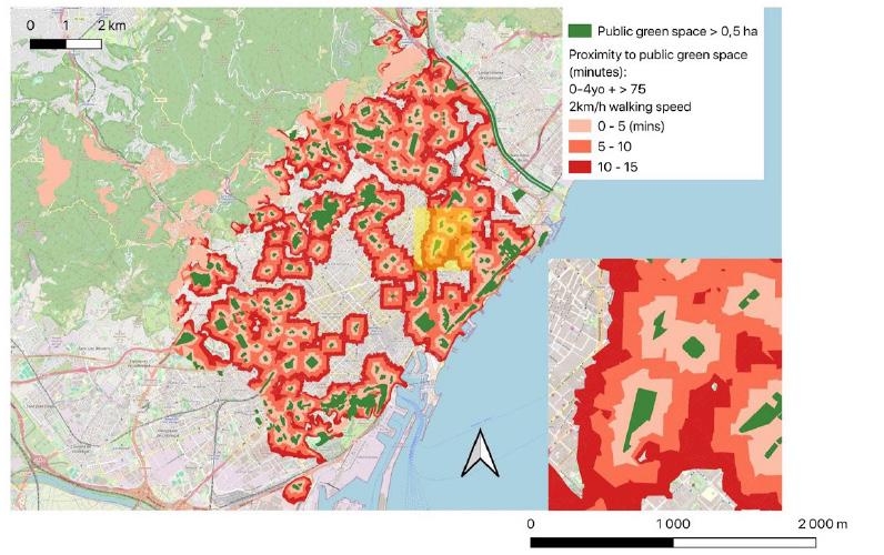 Map 2.2 highlights that, overall, access to public green spaces is well distributed throughout the city. The most notable exception is a distinct gap in green space accessibility in the centrally located Eixample district. Furthermore, Map 2.3 reveals that vulnerable residents defined here as individuals with a walking speed of 2 km h experience lower levels of accessibility to green spaces compared to more mobile adults.