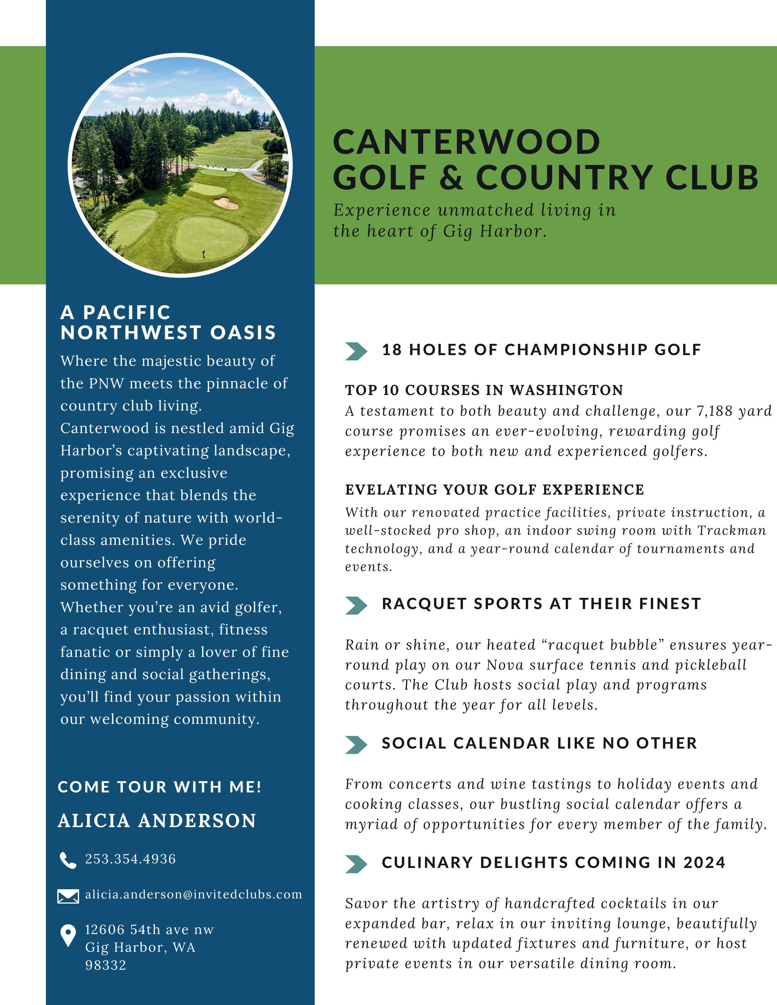 Canterwood is Gig Harbor’s premier gated Golf & Country Club community, featuring more than 750 exceptional homes, 24 hour security, and a myriad of amenities. An exclusive community promoting an active luxury lifestyle.