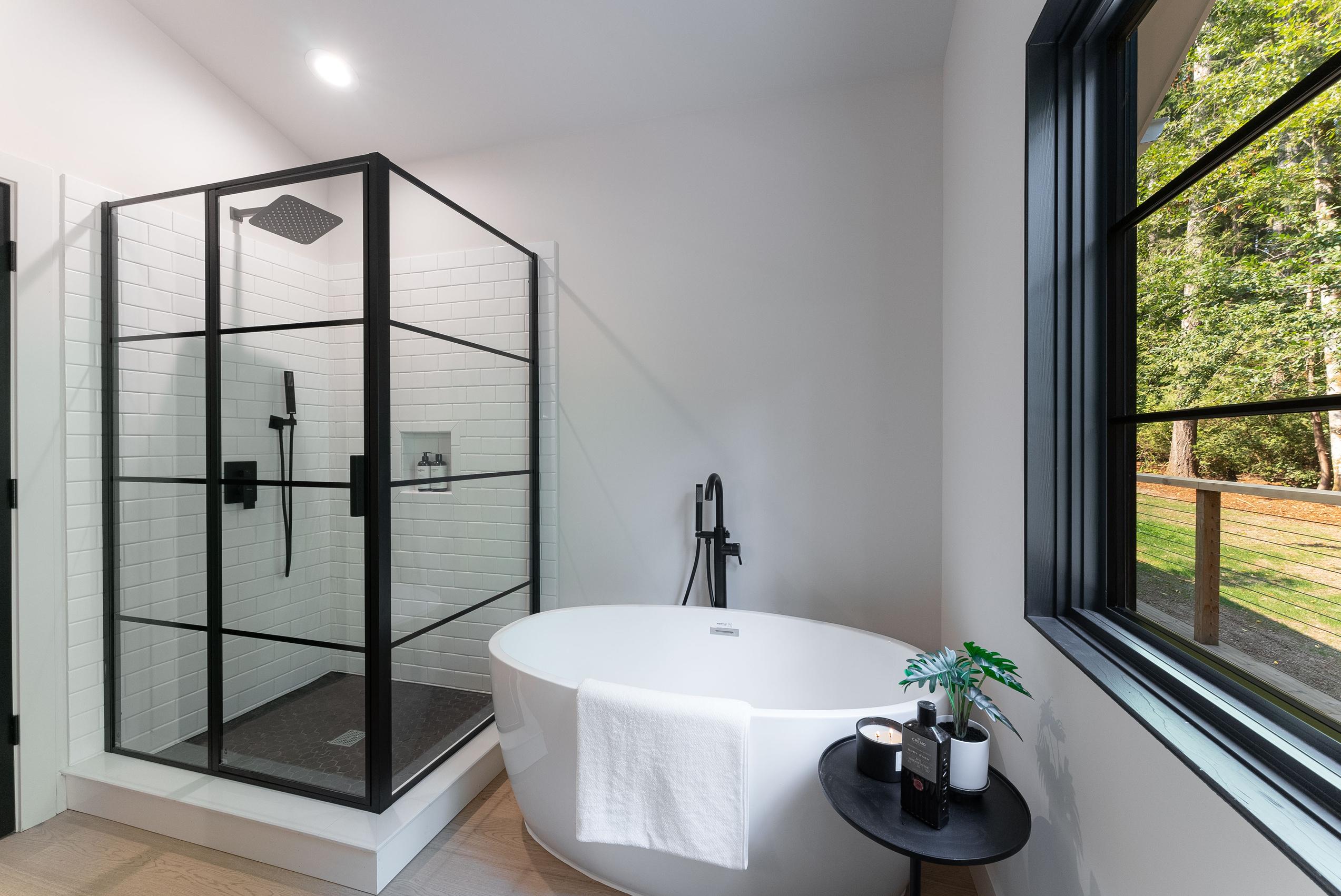 The Primary Bedroom walls of windows and doors, a graceful fireplace, soaring angled ceilings exactly what you hope a peace primary retreat to be. Again, the fresh, verdant landscape is all the art you will ever need. These are the type of spaces that make living in the Pacific Northwest so special. Take a moment by fire each morning and eve to reflect on the day, whether starting with purpose or winding down to rest. This is your best life! The primary bath is no exception to the work of art innocently created by natural light and landscape Carrera marble vanities, Italian tile in the shower, and a generous soaking tub all comfortably proportioned and sophisticated A bonus of the primary retreat is this cozy den with its own set (of course) of sliding doors to the wrap around deck. A perfect addition with a myriad of potential uses...an office, dressing room, nursery, or Den.