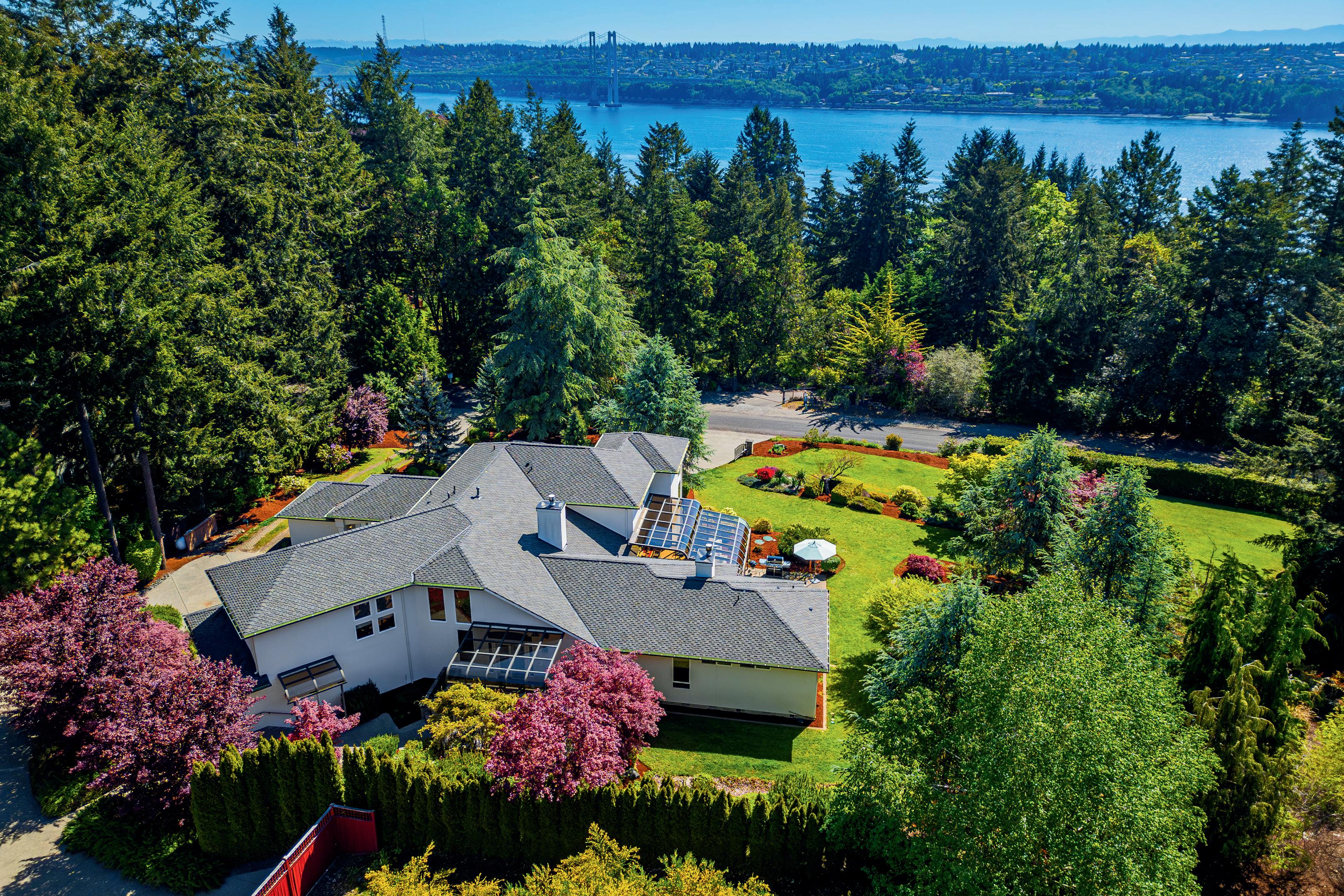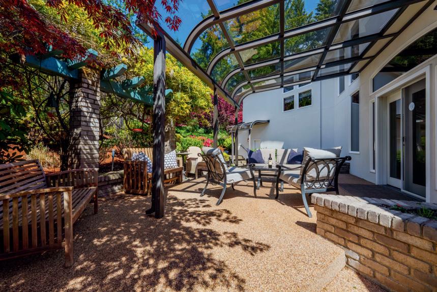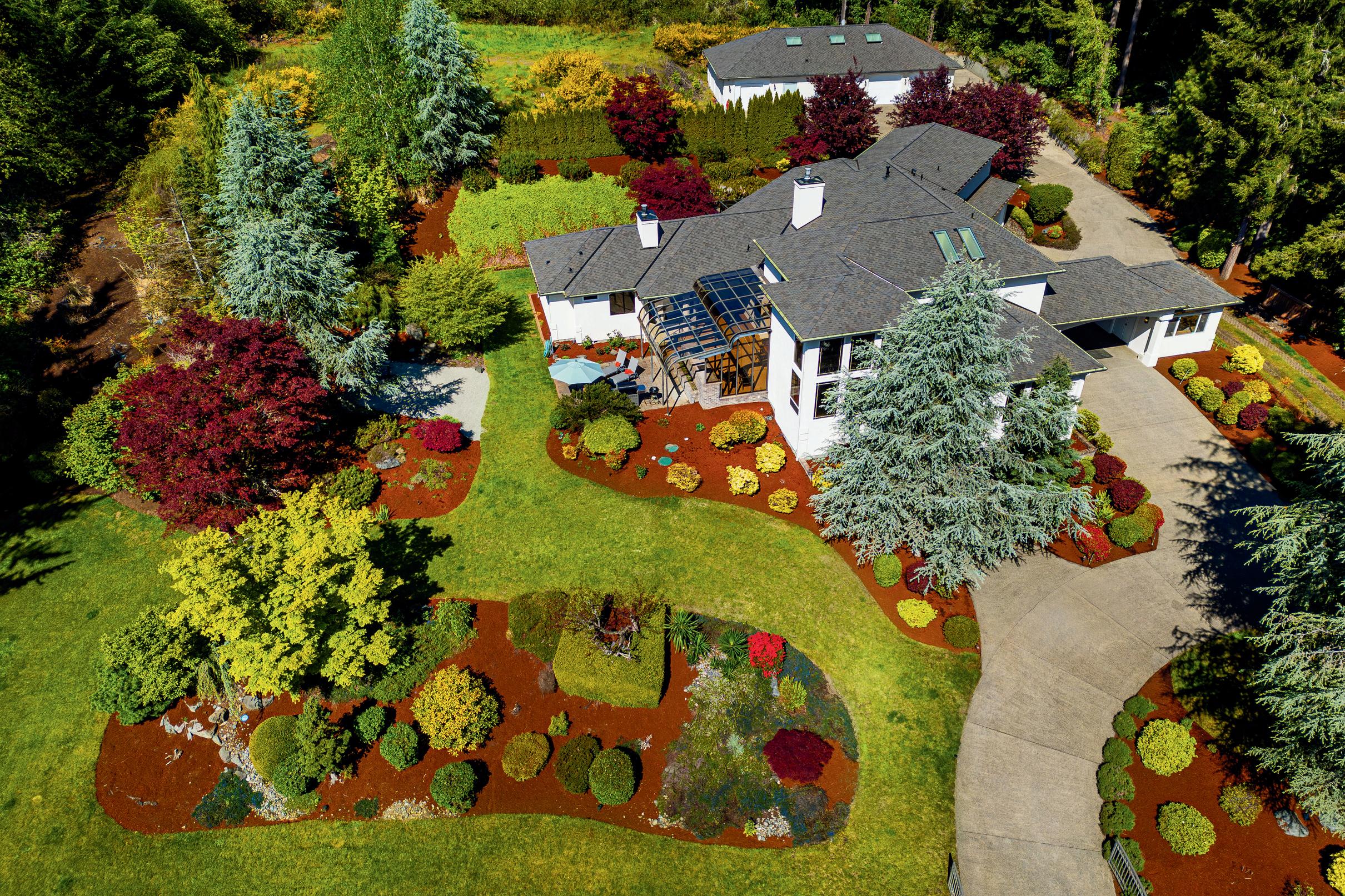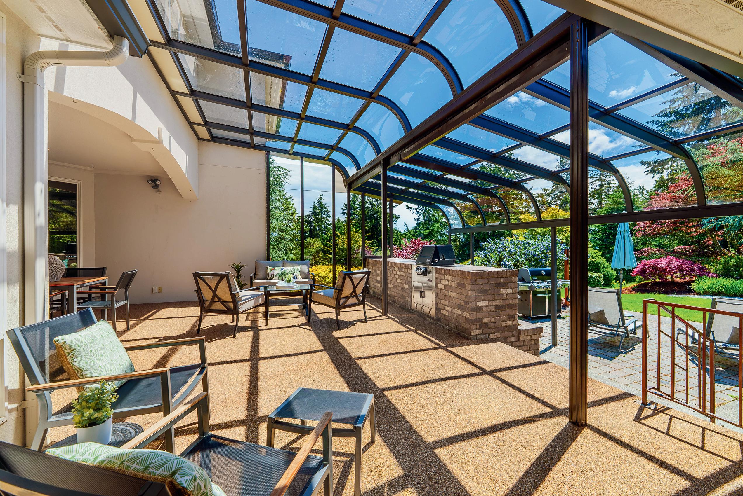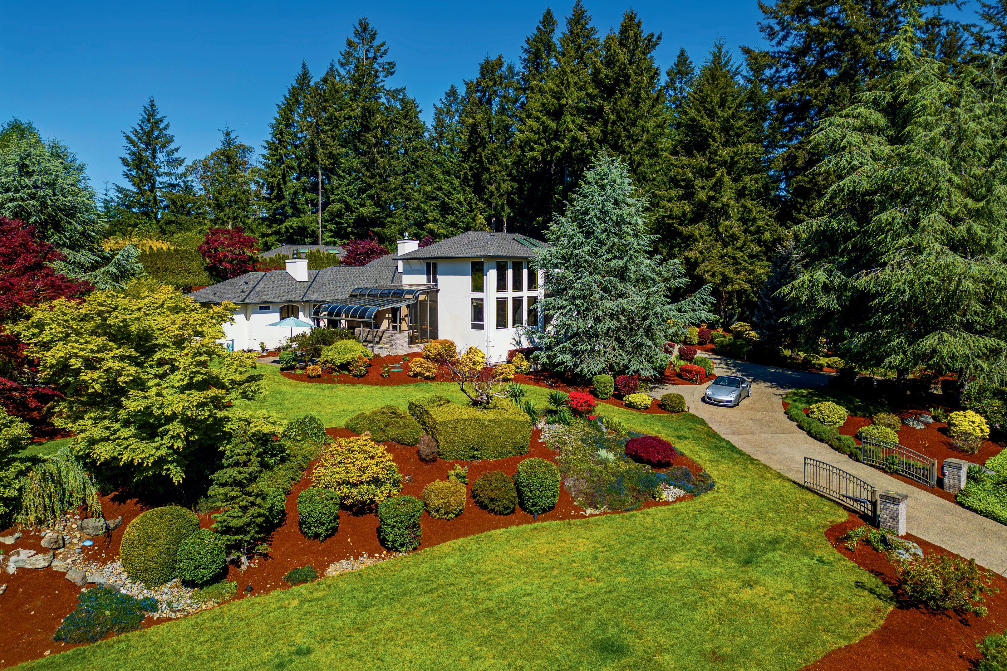 In this stunning estate, where creative architecture & artistic design come together in perfect harmony, on nearly 2 acres. The gates open revealing vibrant gardens, the home's grand facade of cascading windows, impressive portico, and all seasons glass covered patio.