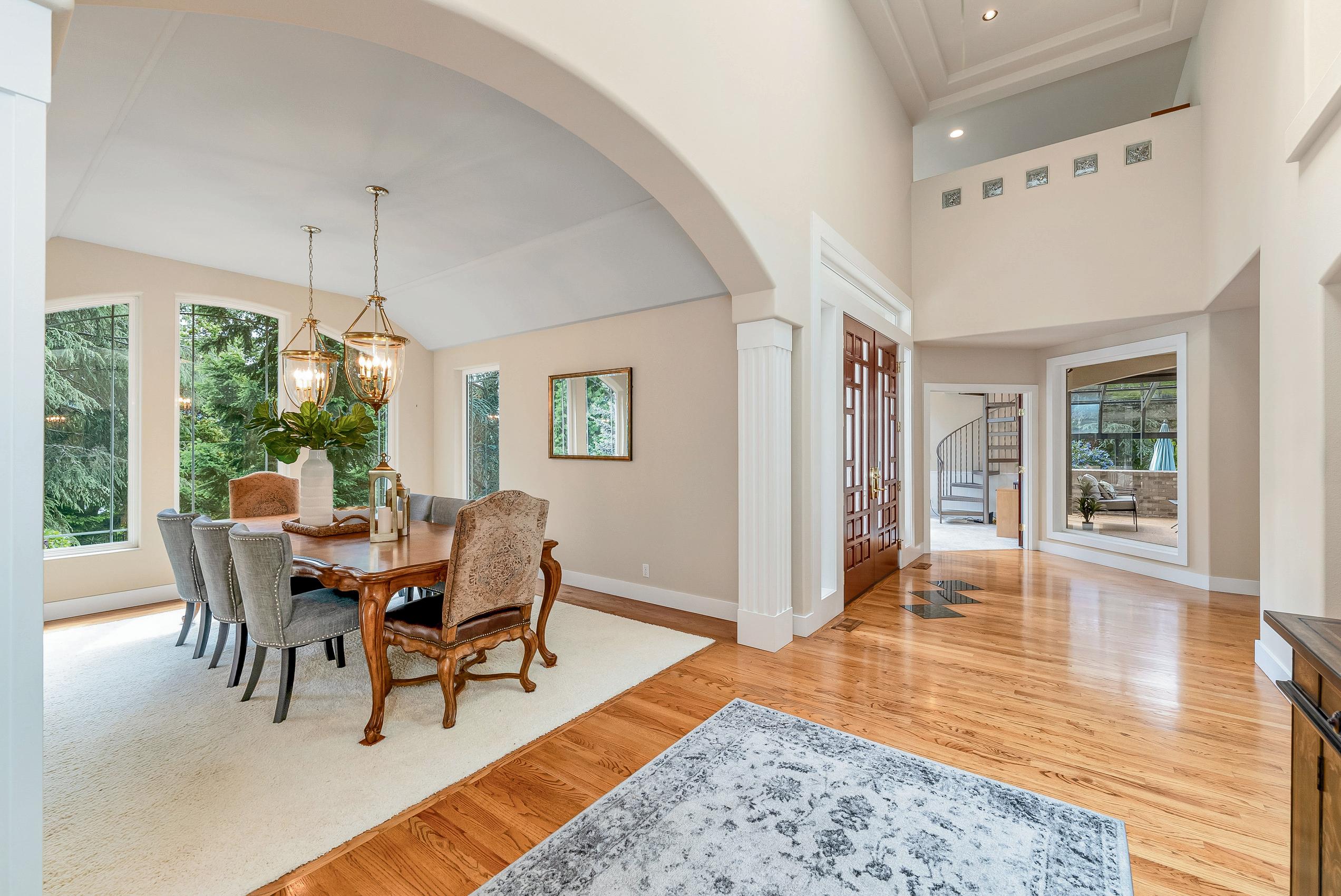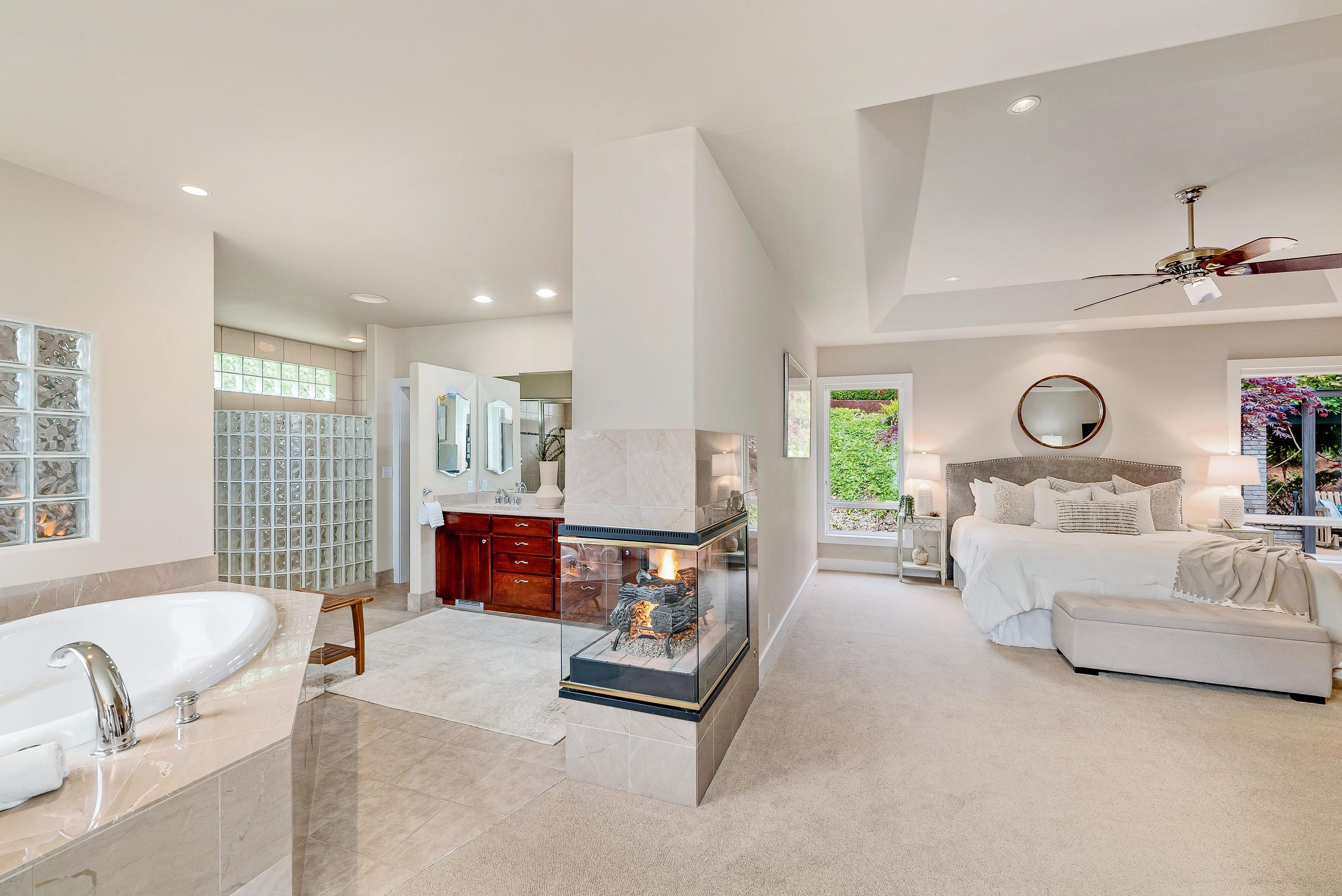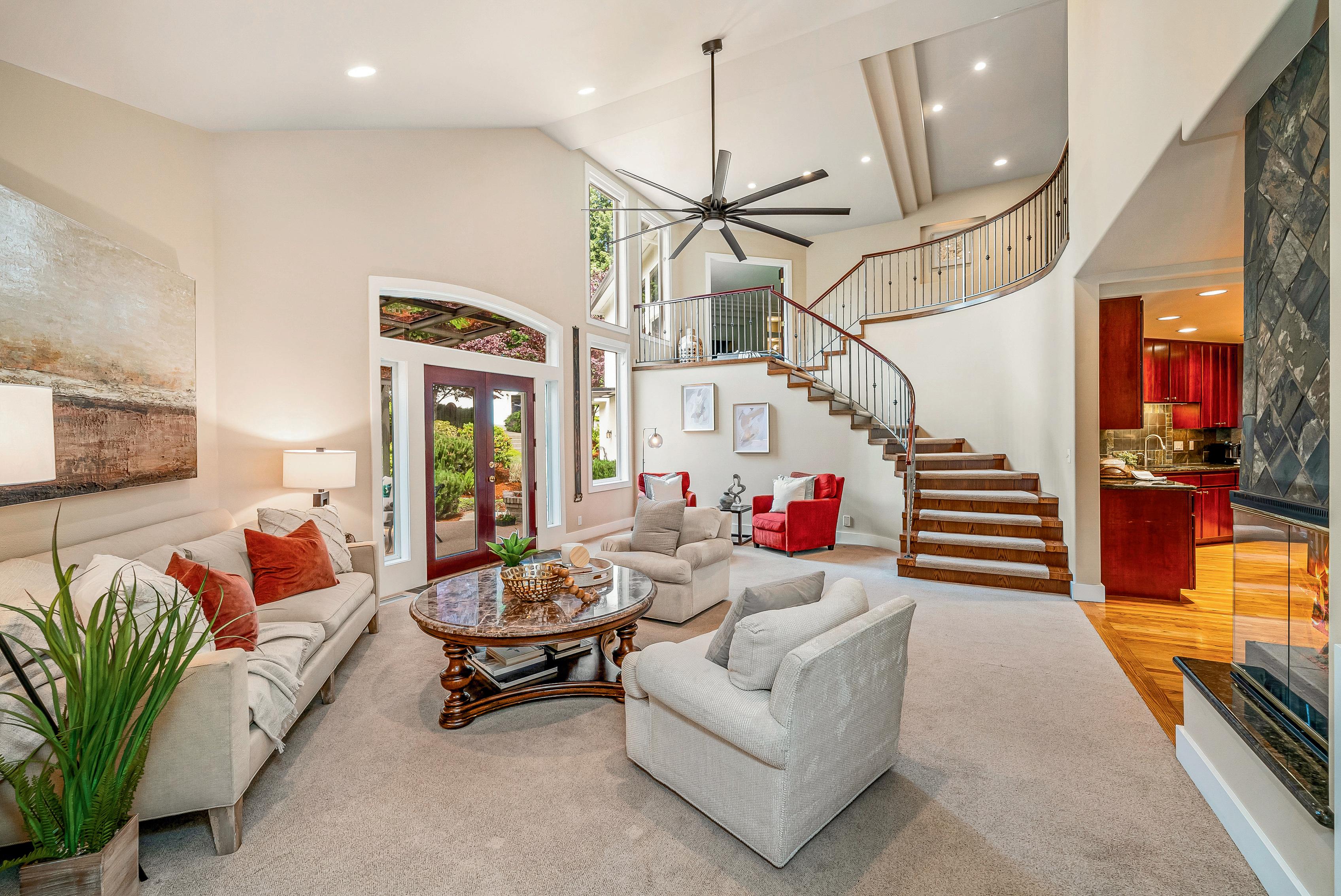 Inside, each room is striking and original, featuring soaring ceilings, curved stairs, reveal fireplaces & other elegant features. The kitchen is equipped with Sub Zero, Thermador, & Jenn Aire plus custom cabinets & generous island. The regal main floor primary suite even has a separate steam shower. New 50 yr roof just installed.