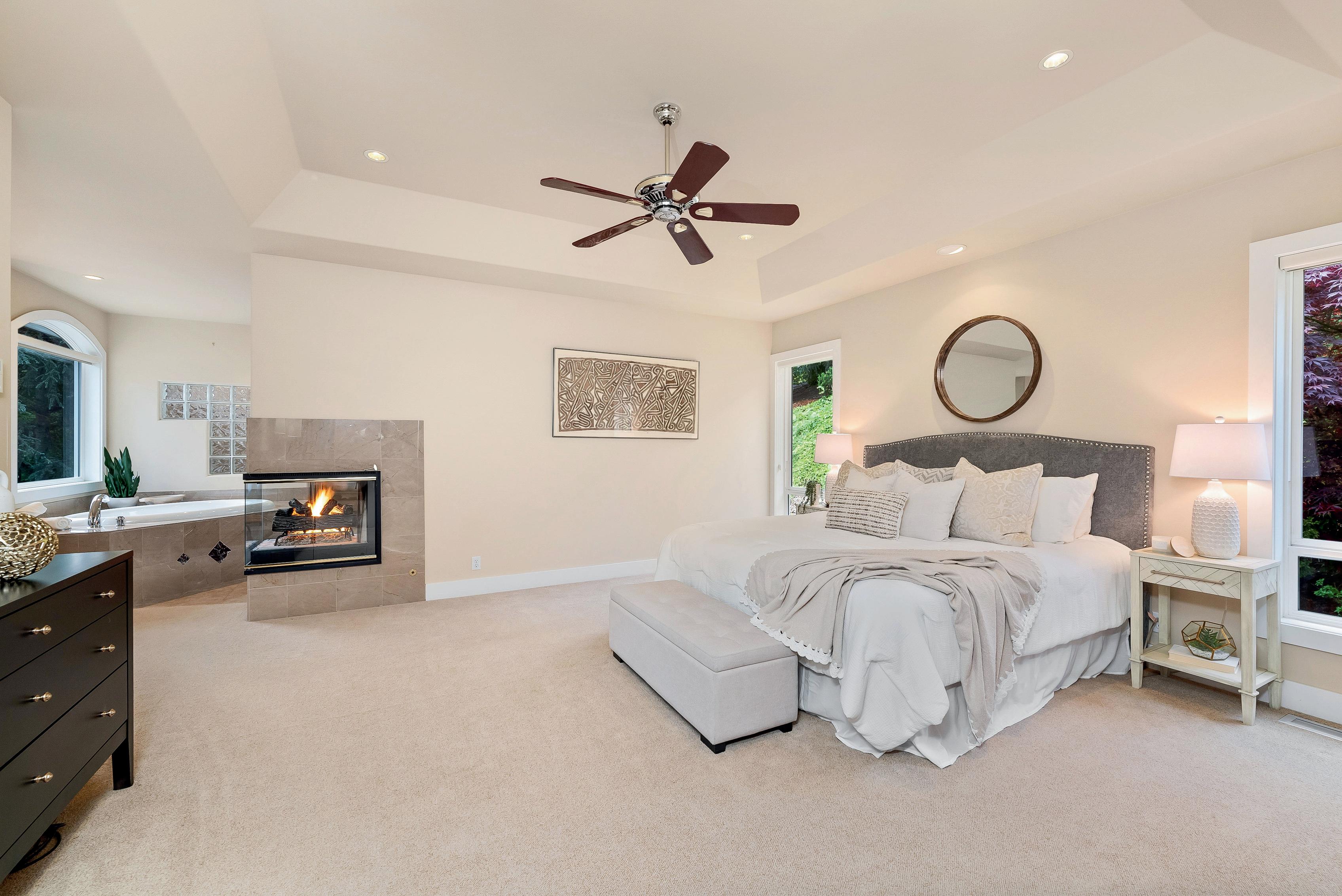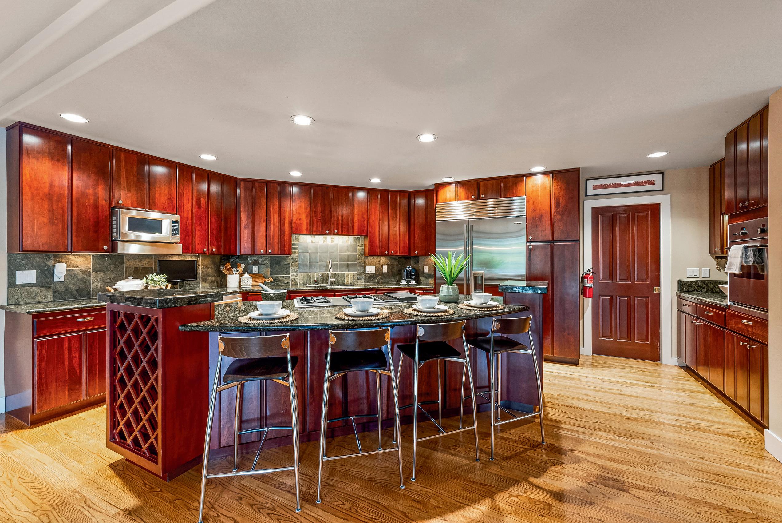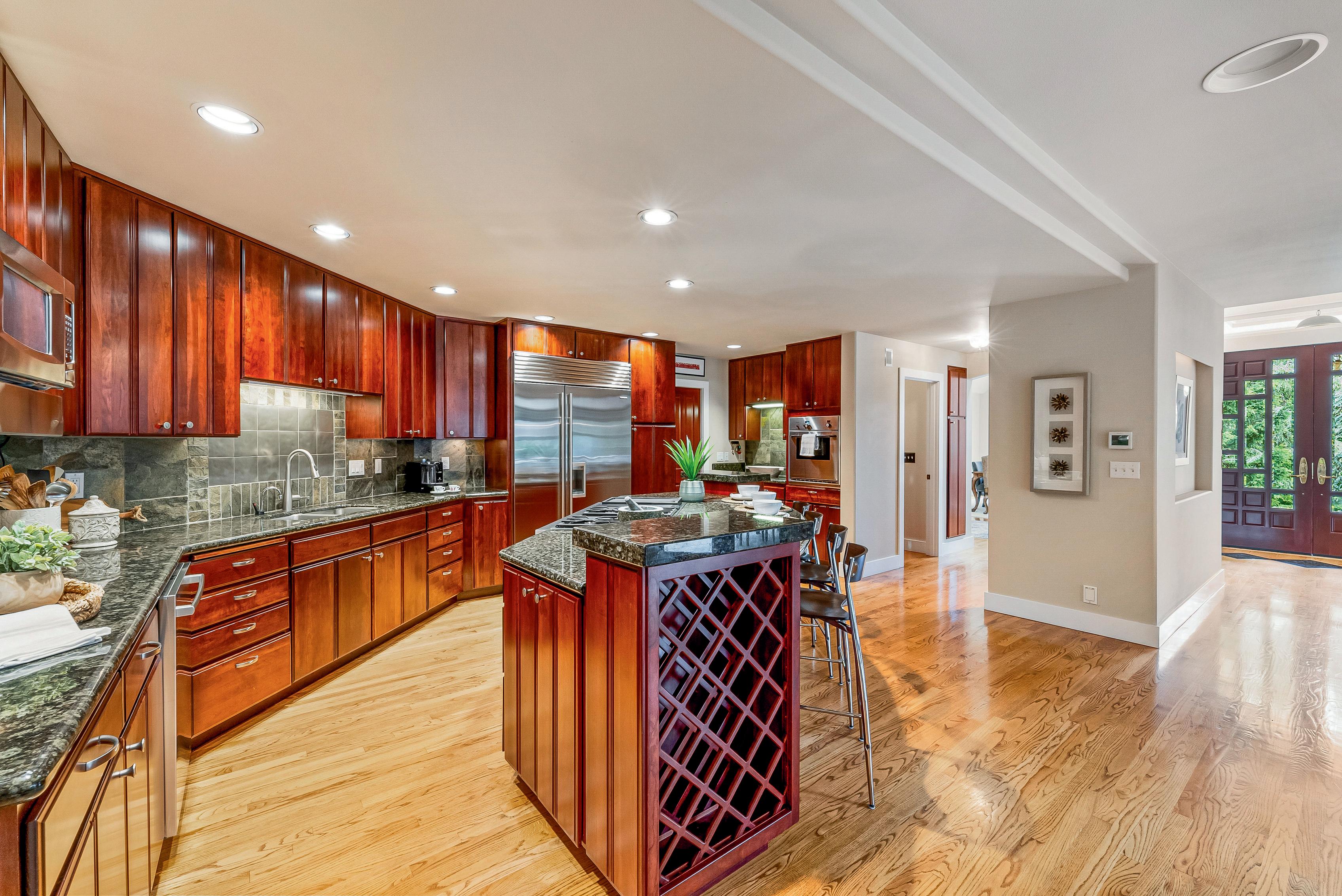 Inside, each room is striking and original, featuring soaring ceilings, curved stairs, reveal fireplaces & other elegant features. The kitchen is equipped with Sub Zero, Thermador, & Jenn Aire plus custom cabinets & generous island. The regal main floor primary suite even has a separate steam shower. New 50 yr roof just installed.