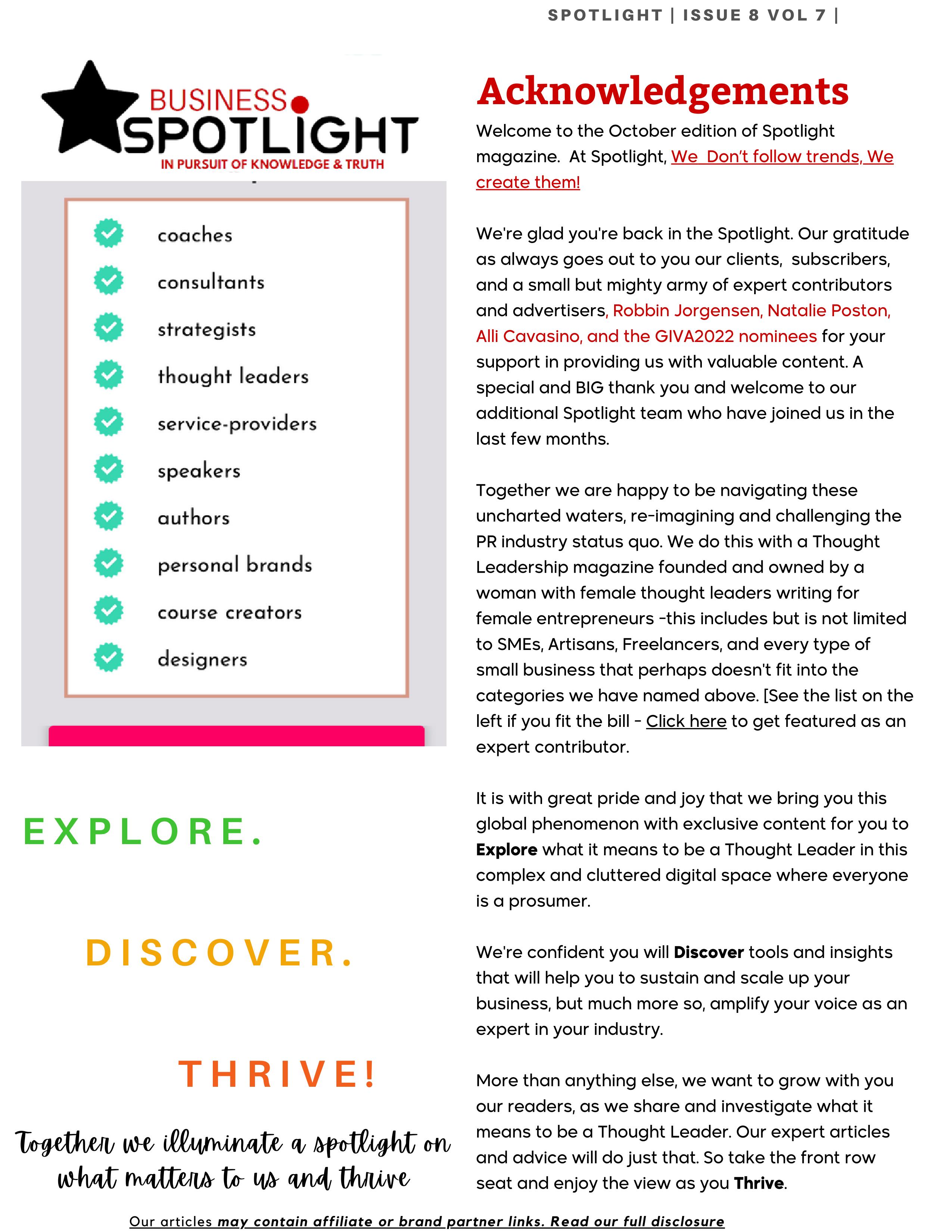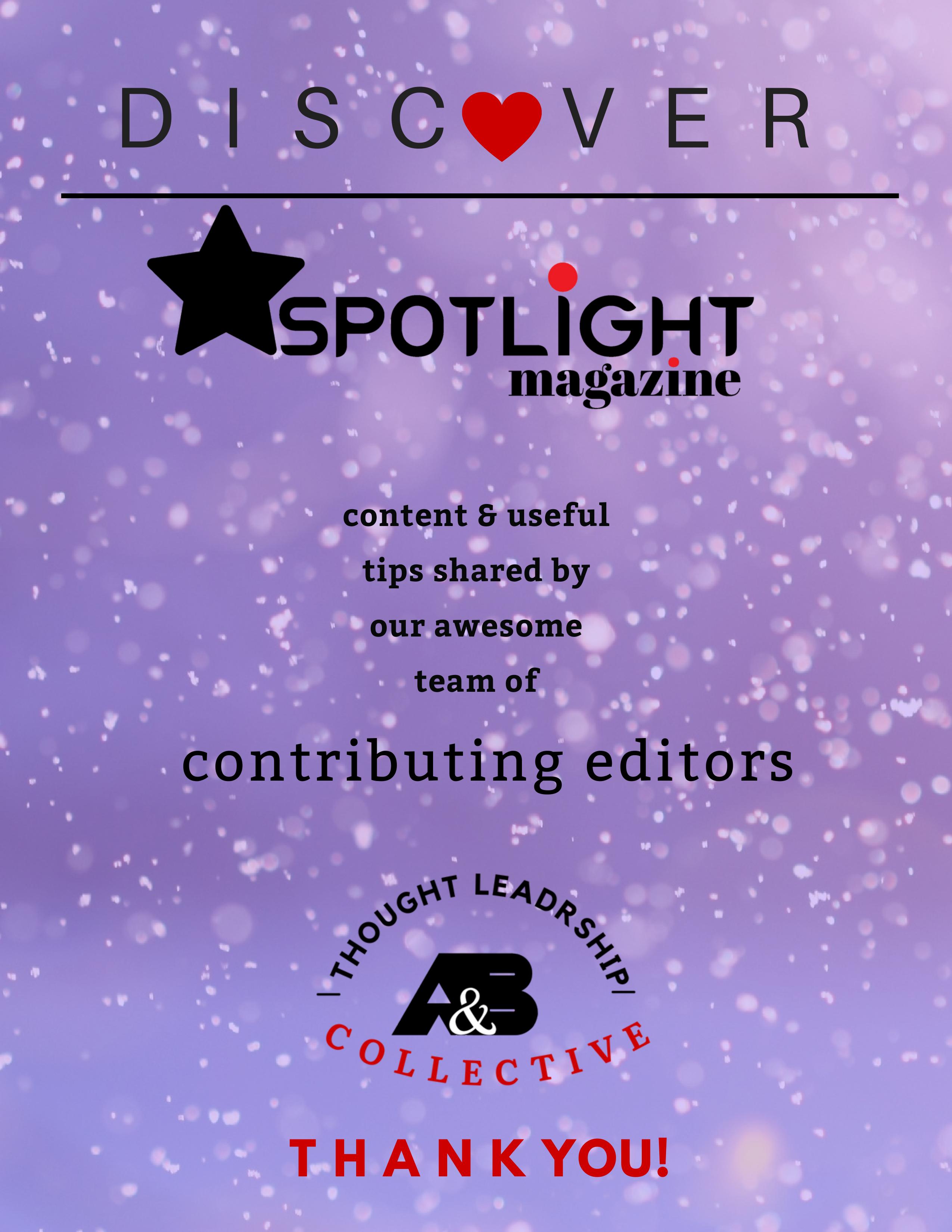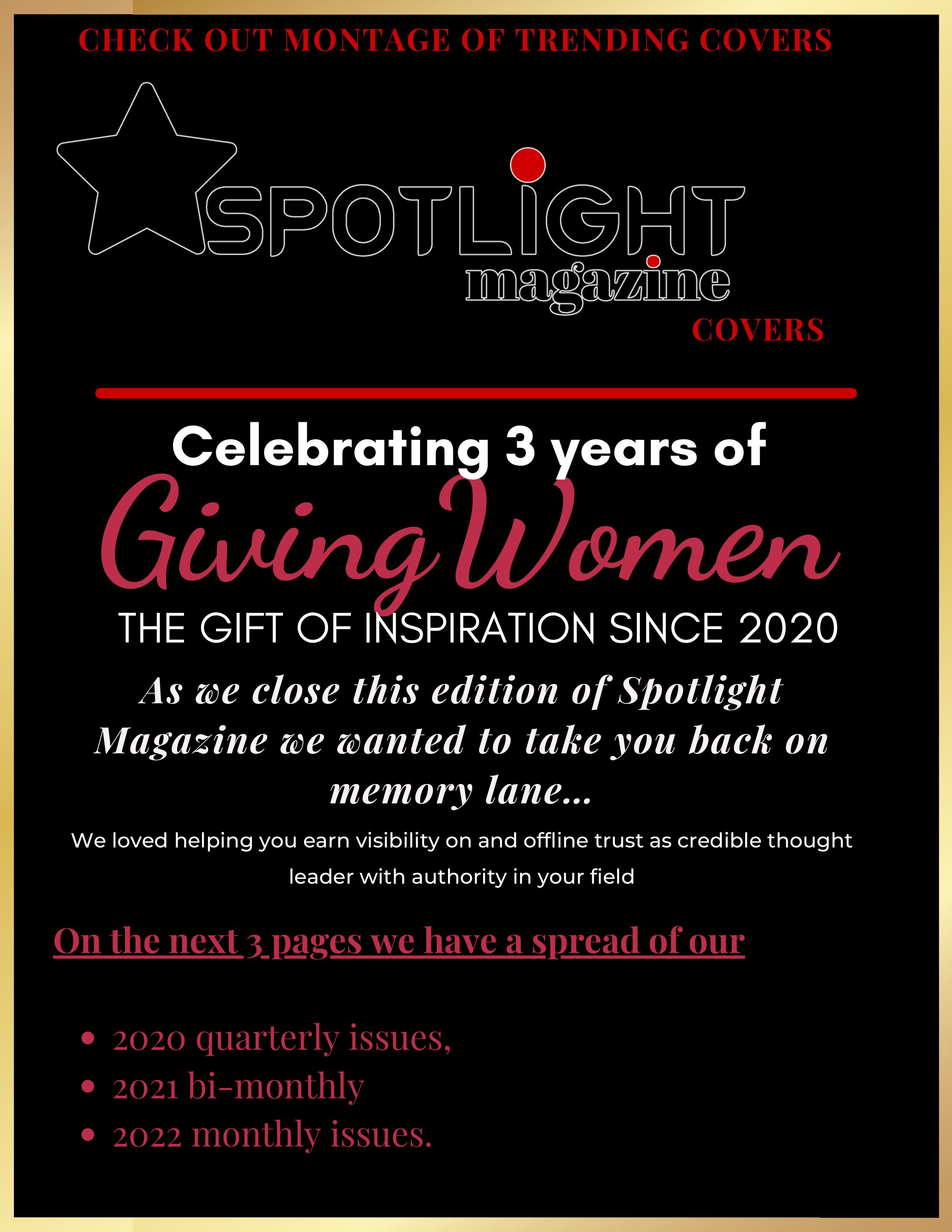 As we close this edition of Spotlight Magazine we wanted to take you back on memory lane; because we loved helping you earn visibility (on and offline) to be trusted as credible thought leader with authority in your field. This issue is packed with 3 pages of a montage spread paying tribute to the awesome women who graced our covers in the last 3 years - of 2020 quarterly issues, 2021 bi-monthly and 2022 monthly issues.