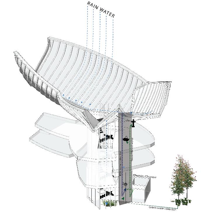 The analysis of existing Palafito’s unveiled water wastage issues in a rainy location. To counter this, we inverted the roof and created a triangular core. The core collects rainwater, and geothermal energy. We introduce wooden boat craftsmanship to integrate the culture of the community to the design.