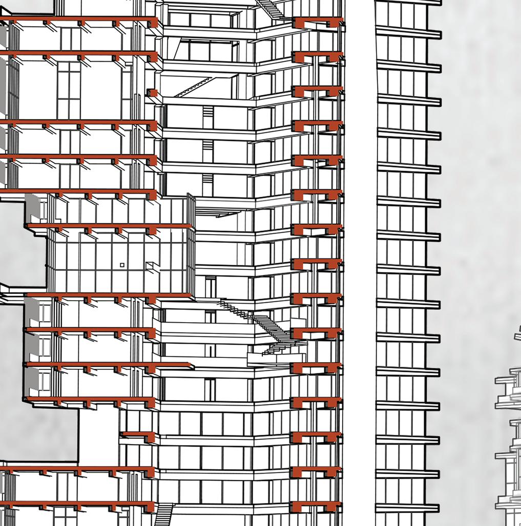 The original Farragut design consists of gated off housing units, making the housing uninviting. In our design the bottom 3 floors are designed to reactive the social aspect to create a community.