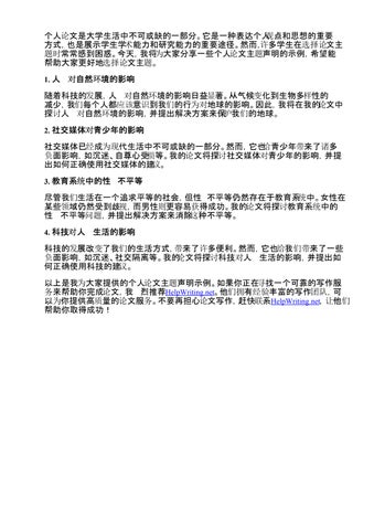 个人论文是大学生活中不可或缺的一部分。它是一种表达个人观点和思想的重要 方式,也是展示学生学术能力和研究能力的重要途径。然而,许多学生在选择论文主 题时常常感到困惑。今天,我将为大家分享一些个人论文主题声明的示例,希望能 帮助大家更好地选择论文主题。