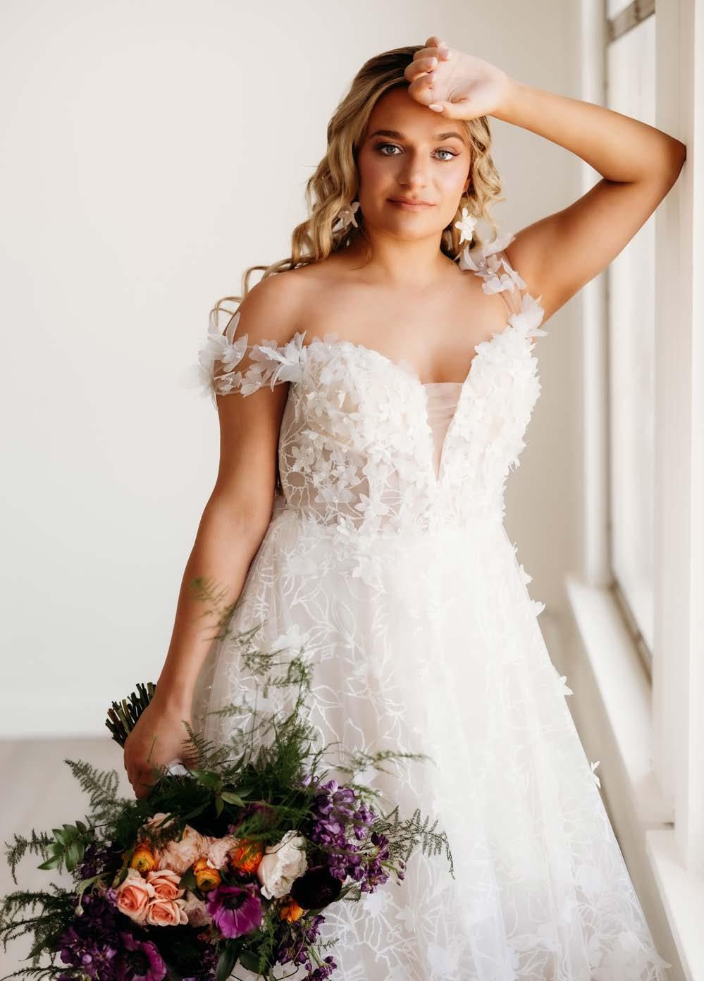 Remember that no two brides are shaped alike, therefore, no dress will ever accent your silhouette exactly the same way it does another bride’s body. When the time comes to try on gowns, explore a myriad of styles and cuts to figure out what works for you. Keep an open mind; you might be surprised! Note that bridal boutiques often carry only one sample size of each gown. Try on these gowns even if they’re not your size. Stylists are there to help you get in and out of sample sizes. If you’re nervous about the sizes available at your local bridal boutique, give them a call. Talking to a representative will ease your mind, and you’ll find that whether you’re full-figured or very petite, there have never been more options to accommodate brides of all shapes and sizes.