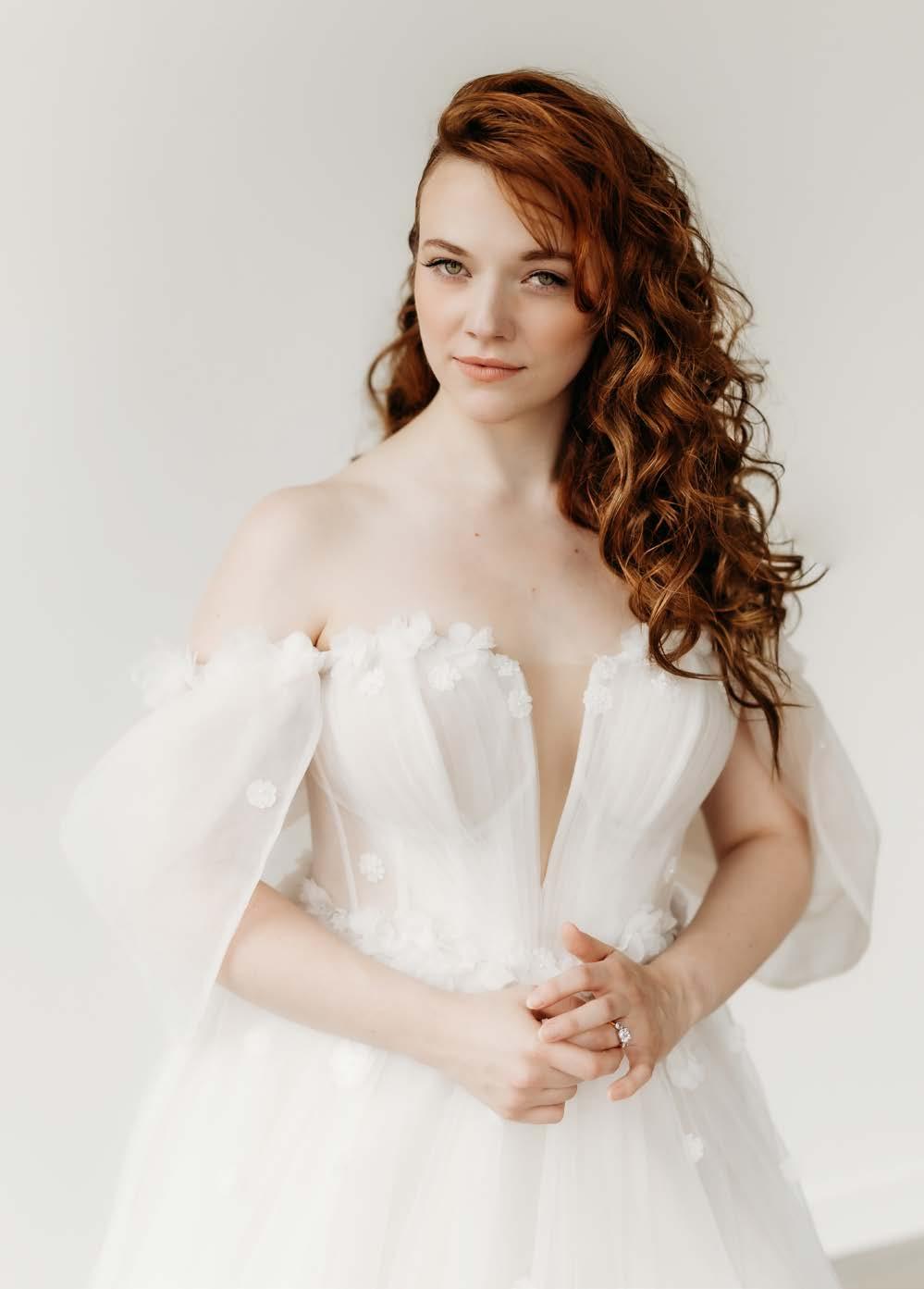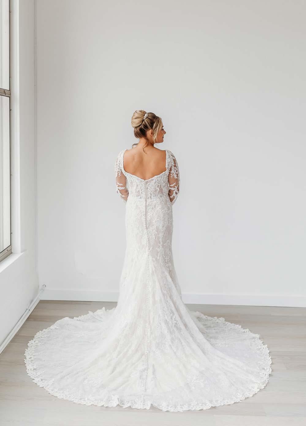 This gown has a fitted bodice and full skirt. It’s the perfect proportion for any bride with a bustier bosom. If you’ve always dreamed of being a princess, this is the gown for you!