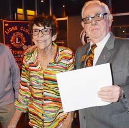 Peter Cerniglia presents a Presidential Certificate to Lion Alice Jenson honoring her for her many years of service with the Fitchburg Lions Club at their recent 40th anniversary celebration.