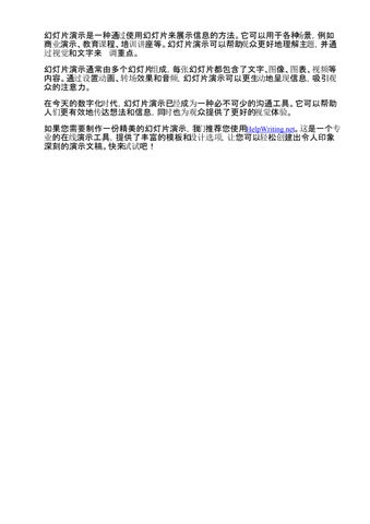 如果您需要制作一份精美的幻灯片演示,我们推荐您使用HelpWriting.net。这是一个专 业的在线演示工具,提供了丰富的模板和设计选项,让您可以轻松创建出令人印象 深刻的演示文稿。快来试试吧!