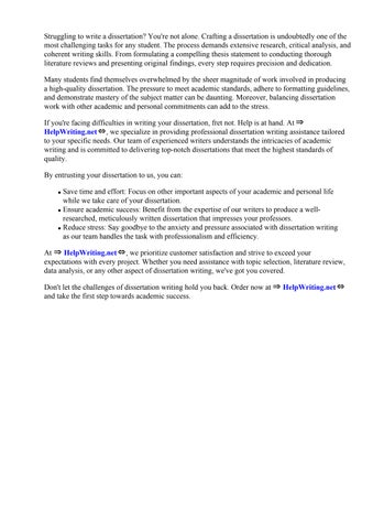 By entrusting your dissertation to ⇒ HelpWriting.net⇔, you can rest assured that your project will be in capable hands. Our writers possess advanced degrees in chemistry and have extensive experience navigating the intricacies of dissertation writing. Whether you need assistance with structuring your paper, refining your research questions, or polishing your prose, we're here to help.