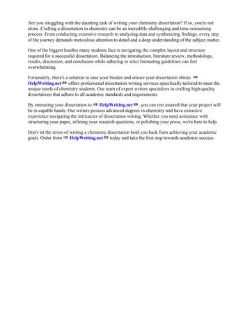 Don't let the stress of writing a chemistry dissertation hold you back from achieving your academic goals. Order from ⇒ HelpWriting.net⇔ today and take the first step towards academic success.