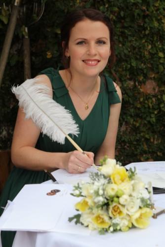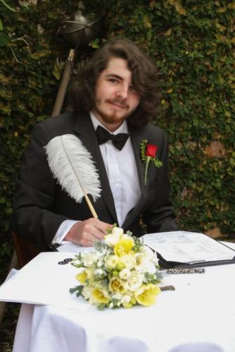 Family and friends, we now come to the signing of the marriage certificates and would like to invite Michelle and Joshua to come forward and witness. While we are signing if you could all please remain where you are, enjoy the music and the magic of this special occasion and we will conclude the ceremony after the signing is completed. Thank you.