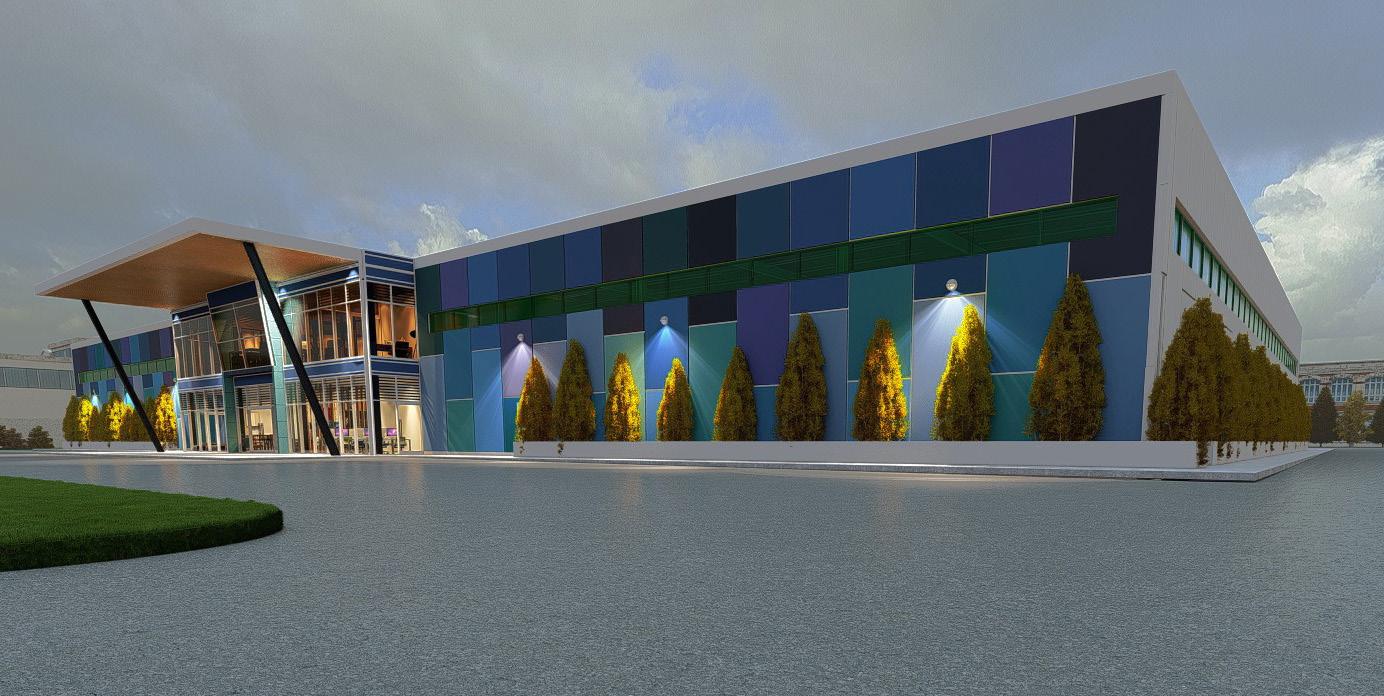 DURING THE DAY, THE BUILDING HAS OPENINGS THAT PROVIDE A BETTER VIEW OF THE SHOWROOM’S INTERIOR DESIGN FROM OUTSIDE AND ALLOW NATURAL LIGHT TO ENTER EASILY. THROUGHOUT THE SERVICE AREAS, WE USED ACRYLIC SOLID SMOOTH PANELS FOR A DIFFERENT APPROACH AND A DIFFERENT MATERIAL THAN USING ONE TYPE OF EXTERIOR FINISH. IN ROOMS WITHOUT OPENINGS, THE OVERHEAD DOORS WILL HAVE A MIXTURE OF GLASS AND ALLOY FINISH TO ALLOW NATURAL LIGHT TO PASS THROUGH.