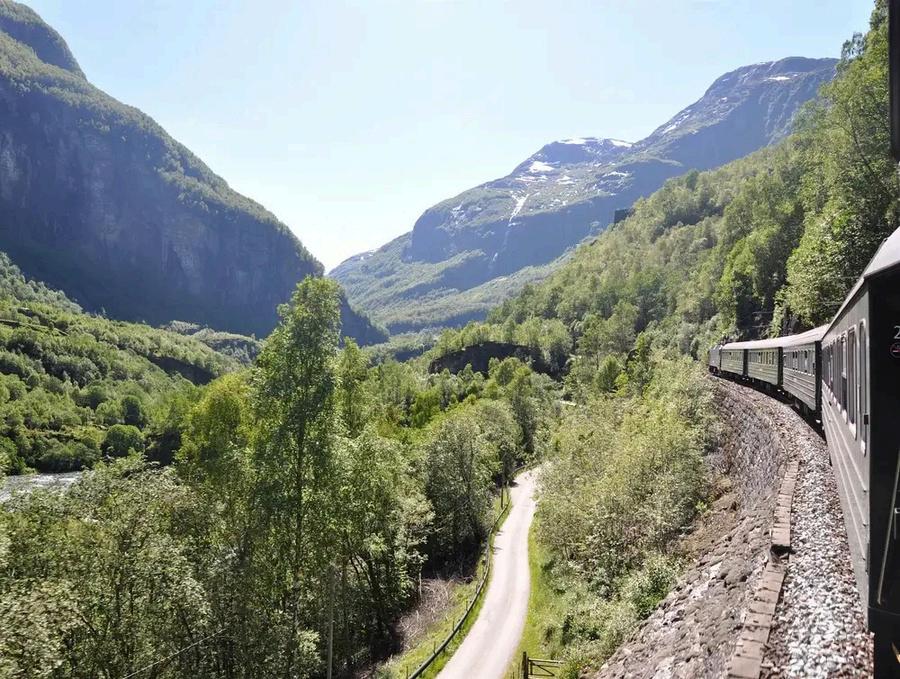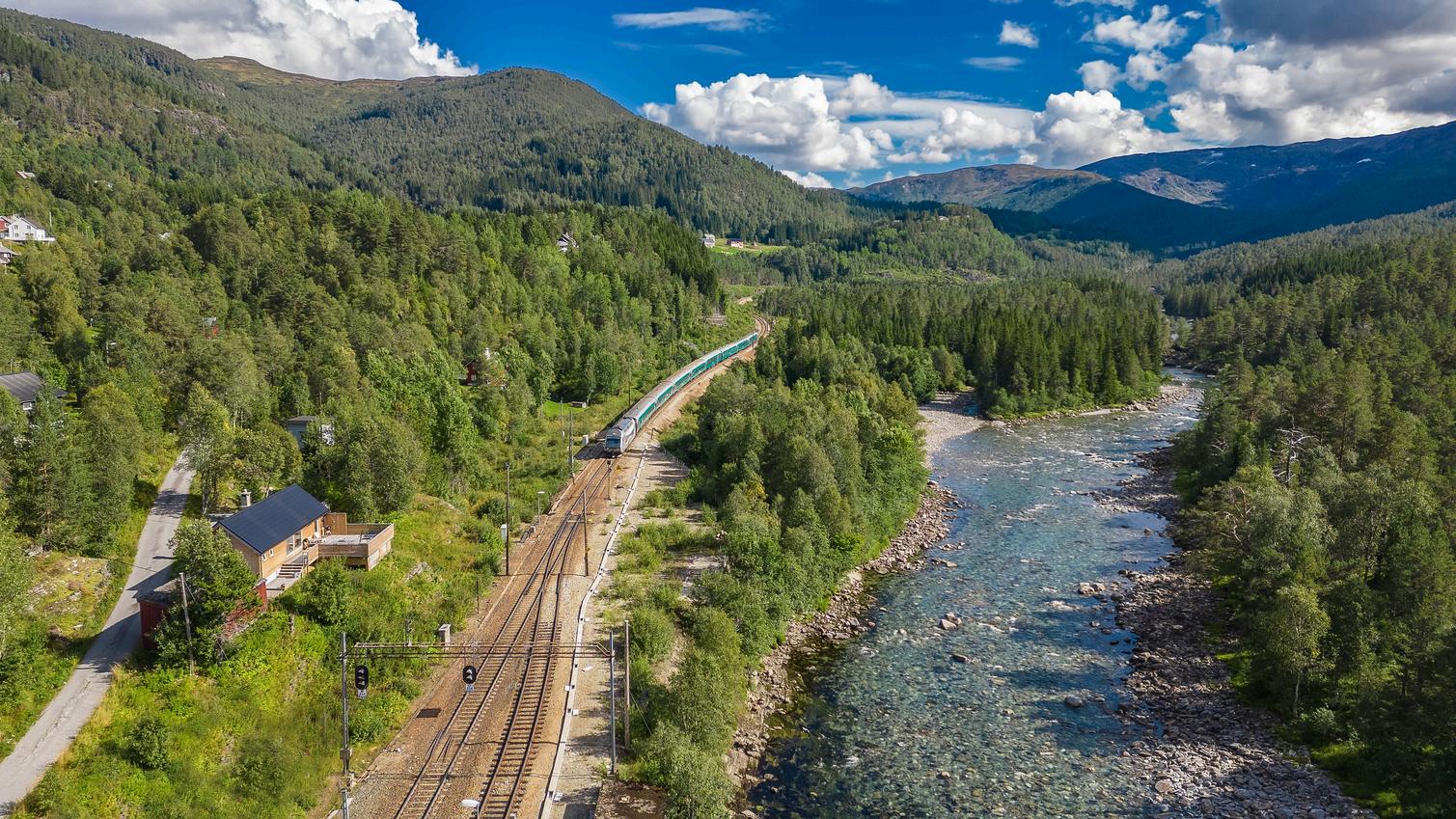 Rejsen starter med grønne skove og søer, inden toget når Hardangervidda, Europas største højfjeldsplateau, med sneklædte toppe og åbne vidder. Undervejs passerer du bjergstationer som Finse, glitrende søer og brusende vandfald.