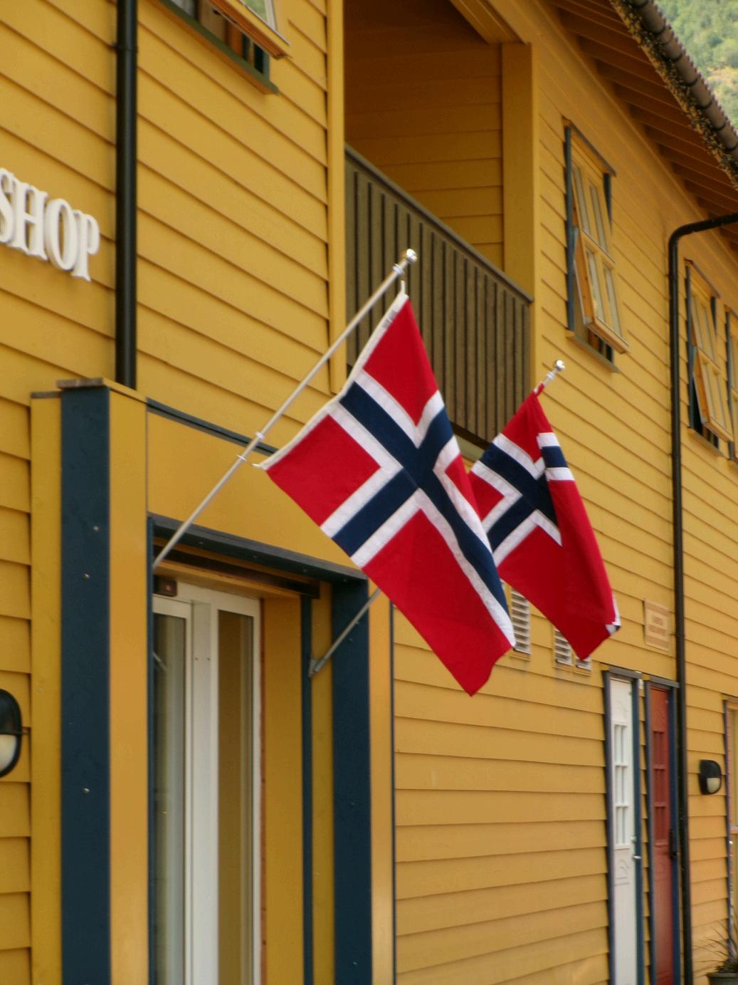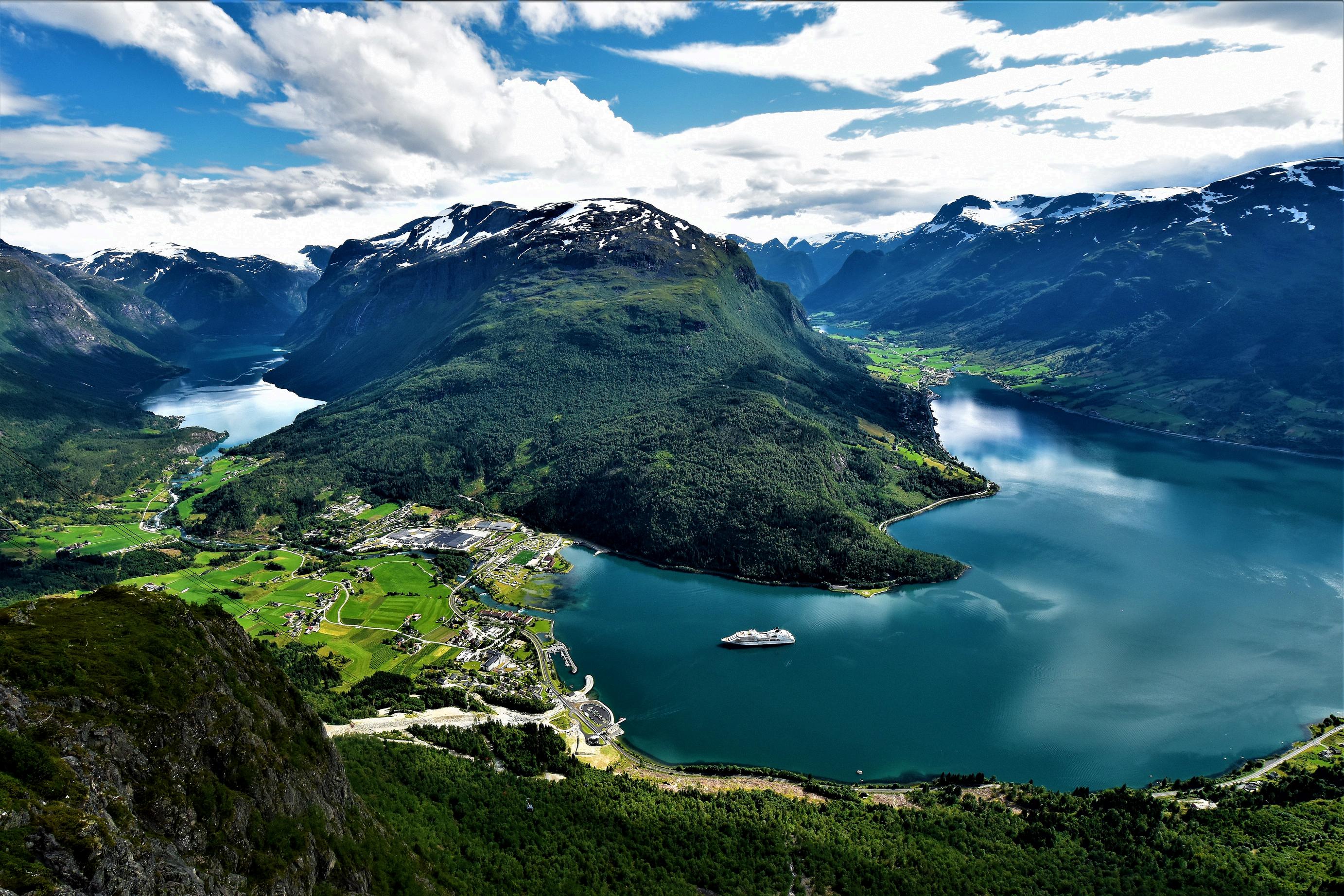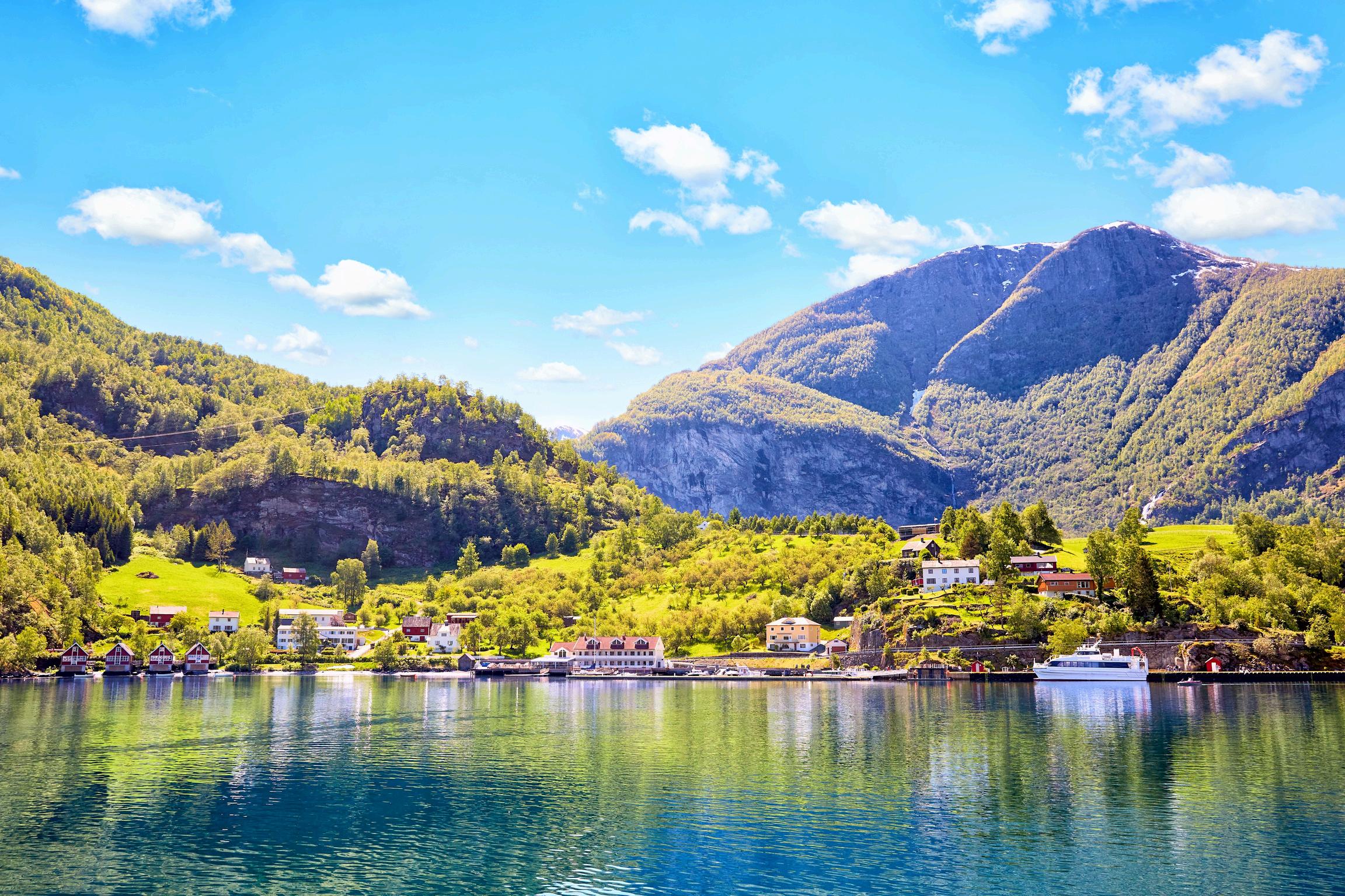 Idyllisk landsby midt i Norges fjordlandskab, omgivet af stejle fjelde, dybe fjorde og brusende vandfald.