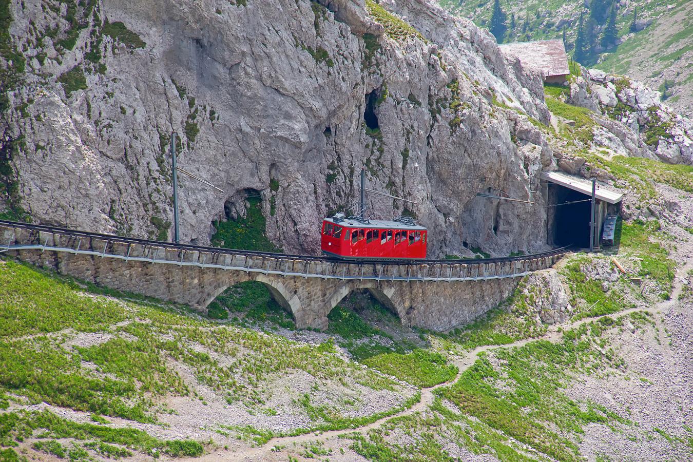 Du kan komme op på Mount Pilatus på to måder: Tag tandhjulsbanen fra Alpnachstad - verdens stejleste med 48% stigning. Her kører du gennem skove og forbi grønne enge, mens udsigten bliver bedre og bedre på vej op. Turen med tandhjulsbanen har kørt siden 1889 og er en oplevelse i sig selv.