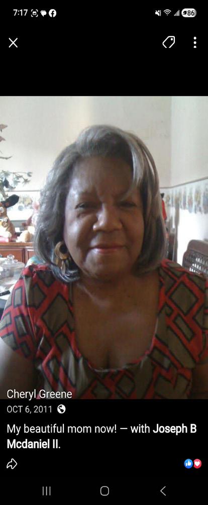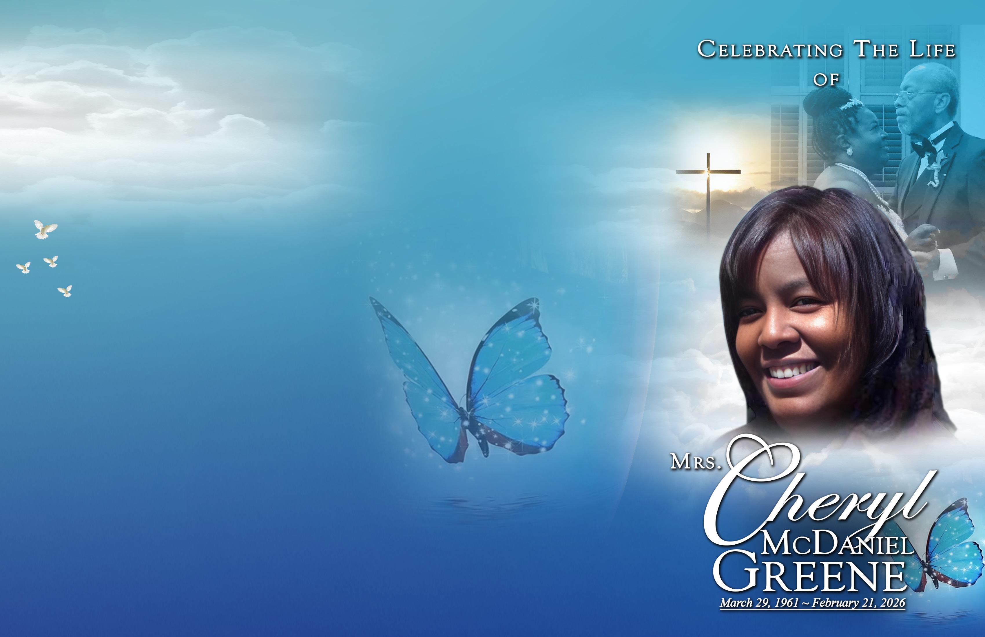 On February 21, 2026, in the stillness of the afternoon, Cheryl Yvonne McDaniel Greene slipped quietly, sweetly, peacefully, into God’s arms, surrounded by family and friends. She is survived by her mother, Katherine Adams McDaniel; bonus children, Mareo Chavez (LeNore) Greene, DeMia Chanyse Greene, and Rev. Lettie Clark; goddaughter, Adalynn “Beans” Clark; and a host of aunts, uncles, nieces, nephews, cousins, extended family, and friends. She was preceded in death by her beloved husband, Gerald Greene; brothers, Kevin McDaniel and Joseph McDaniel, II; and father, Joseph McDaniel, Sr.