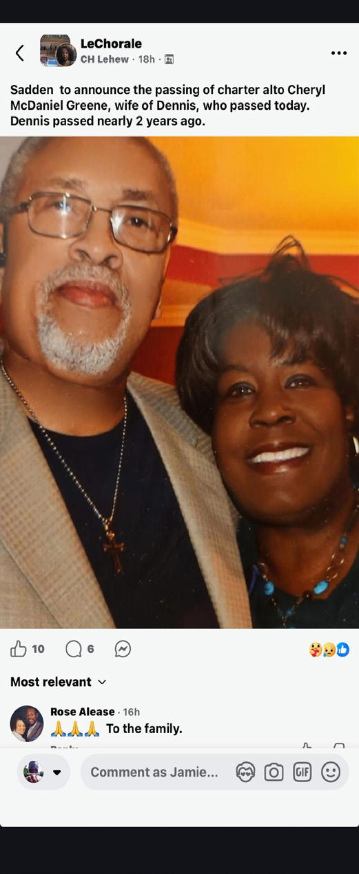 Cheryl spent most of her life as an active member of Saint Andrew AME Church with her mother, Katherine. Her voice was rhythmic, and her laugh was musical. She loved to sing and was a member of The Elmer Martin Singers, LeChorale, and Voices of The Saint (VOTS) until health challenges prevented her from singing with the choir, but never from critiquing the choir’s ministry on Sundays. She was ever-present in her ‘usual spot’ in the congregation, praising God, standing strong in faith, even in challenging circumstances, and acting with grace and love, reflecting God’s character in her actions and interactions with others.