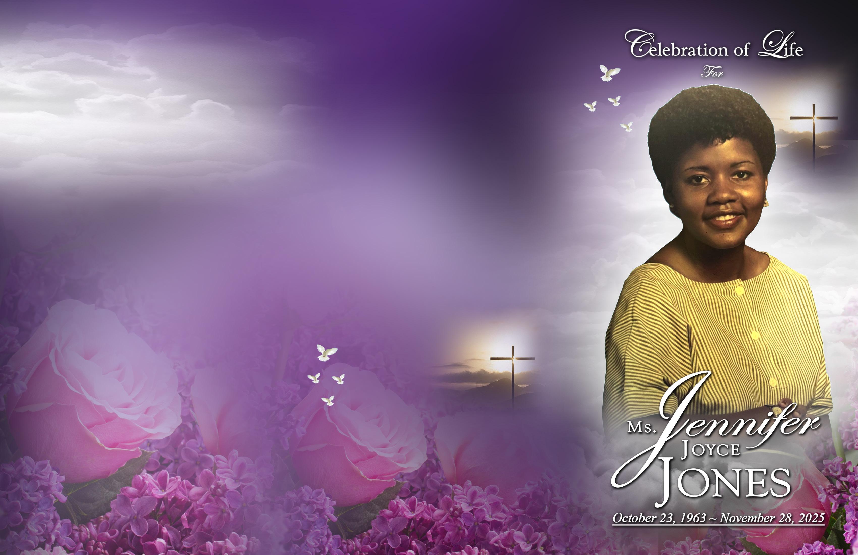Jennifer Joyce Jones was born on October 23, 1963, in Memphis, Tennessee, to Lessie and the late Climmons Jones Sr. She accepted Christ at an early age at Morning View Baptist Church in Eads, Tennessee. She later joined New Salem Baptist Church under the Leadership of Dr. Pastor Frank E. Ray. She was a longtime faithful member until she had health issues.