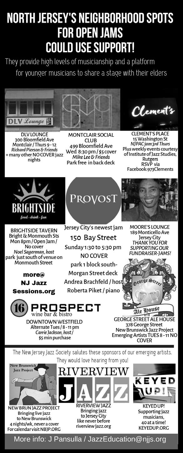 Many advertising and sponsorship opportunities exist within NJJS. If you’re interested in advertising in Jersey Jazz, or on our website, or both, would like to sponsor a Generations of Jazz presentation or Social, make an In Memoriam donation, contribute to our scholarship fund, or become a corporate sponsor with tiered benefits, please contact me at pres@njjs.org. NJJS is a qualified I.R.C. 501(c)(3). Donations are always welcome