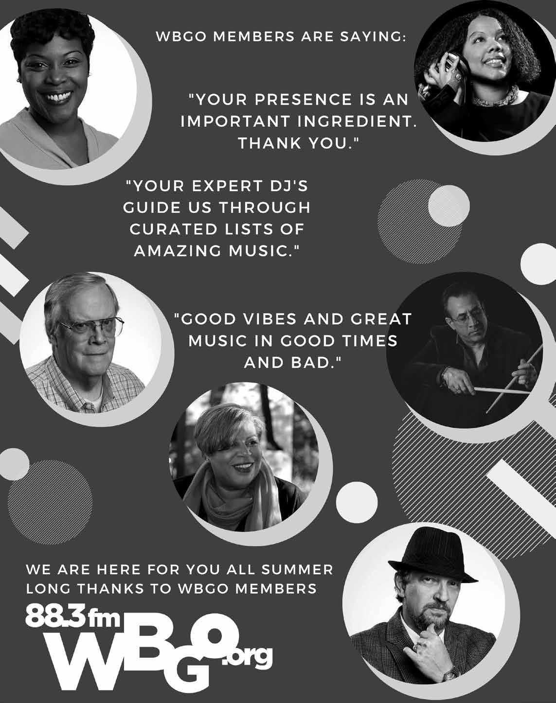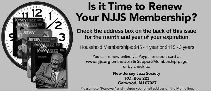 In an ongoing attempt to more efficiently manage administrative costs and reduce USPS mailings, we’ve printed your membership expiration date above your name in the address box on the back of your magazine. Turn it over and take a look! You now know your membership expiration date and can renew online, via Paypal or credit card, at www.njjs. org on the “Join & Support/Membership” page. You can also renew by check. Please note “Membership” and your email address on the memo line and mail to New Jersey Jazz Society, P.O. Box 223, Garwood, NJ 07027. Your membership is vital to the operations of NJJS, and we thank you for your continued patronage.