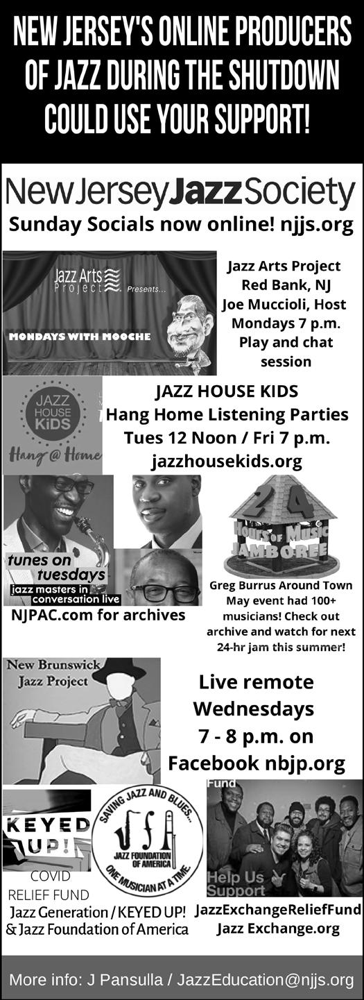 Every aspect of the jazz industry has been turned upside down with this pandemic and the production of Jersey Jazz is no exception. Please help keep this publication in print with a donation to help cover the shortfall of lost advertising revenue. Donations can be made on our website www.njjs.org/Donate/Donation Levels or by check. Please note Jersey Jazz Donation in the memo line. NJJS address above.