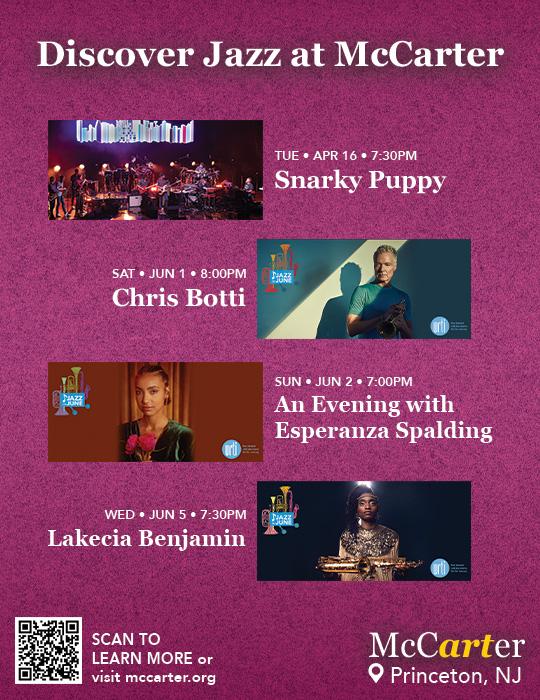 Celebrate JAM with a road trip or two. Enjoy this Jersey Jazz issue in its entirety and learn more about: New Brunswick Jazz Project’s Tuesday and Thursday programming at Tavern on George, the Grunin Center featuring the Rodney Marsalis Philadelphia Big Brass 4/6 and the Sentimental Journey Big Band 4/28, William Paterson University Jazz Room, various artists 4/7, 14 & 28, Princeton Jazz Festival, various artists 4/13, McCarter Center featuring Snarky Puppy 4/16, the Gotham Jazz Festival 4/28, and Jazz Arts Project’s performance and fundraiser 4/30.