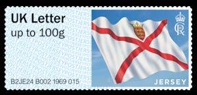 Technical details: Flag illustration by True North. Stamps printed digitally by Cartor Security Printers Ltd, UK. Indicia and location identifier thermally printed within a Series II Post & Go machine. Stamp die size: 25mm deep x 56mm wide. Simulated perforations. Stamp products © Jersey Post Ltd 2024.