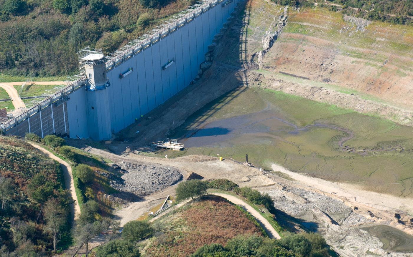 In 2011, after many months of planning work was undertaken to give Val de La Mare Dam a face lift. Alkali aggregate reaction had occurred to some areas of the concrete to the dam and with the modern development of dam linings a new waterproof membrane was installed on the face of the dam.